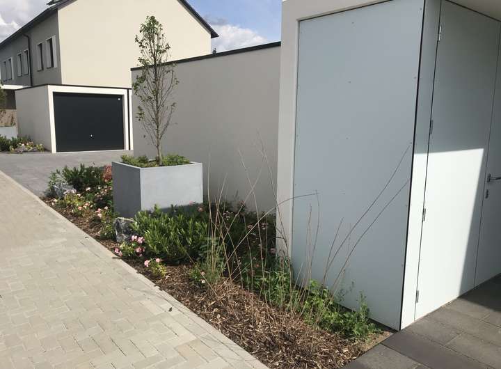 - Terrassenschrank und Schrank für Gartengeräte im Garten (mit extensiver Dach-Bepflanzung)