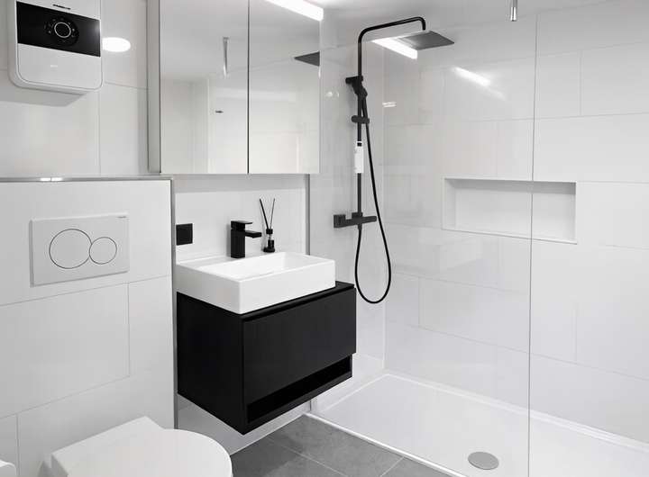 Der Mittelpunkt des Hauses ist im Erdgeschoss der helle Wohnbereich mit offener, kompakter Küche. Zusätzlich befinden sich auf dieser Ebene ein Schlafzimmer sowie das moderne Badezimmer.