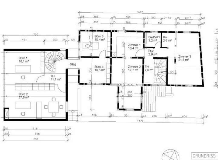Die eine Hälfte des Hauses wurde 1657 erbaut (Denkmalschutz) und 1984 umfassend saniert. Dabei entstanden drei abgeschlossene Wohnungen (pro Etage eine Wohnung//teilweise seit längerem vermietet) und dazu noch im Erd- und Obergeschoss jeweils ein Büro-/Praxisteil. Diese beiden Büro-/Praxisteile sind aktuell der zweiten, neueren Hälfte des Hauses zugeordnet (Baujahr 1996) - dies kann aber mit geringem Aufwand wieder rückgängig gemacht werden. Die Aufteilung der Etagen und die Wohnfläche der Wohnungen siehe "Ausstattung".