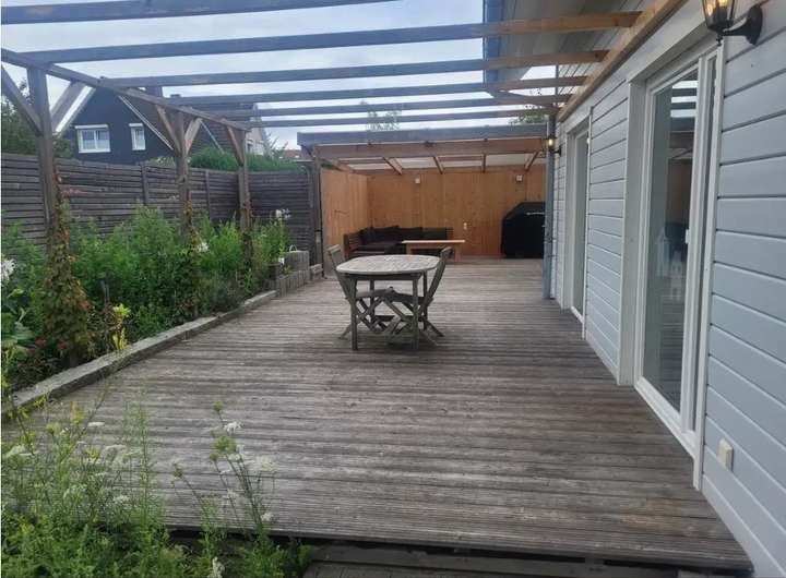 • Großzügige Holzterrasse (80 m²) mit Überdachung, Grillecke, Pergola und gemauertem Sandkasten
