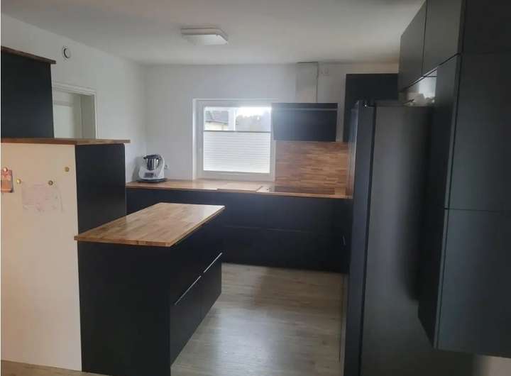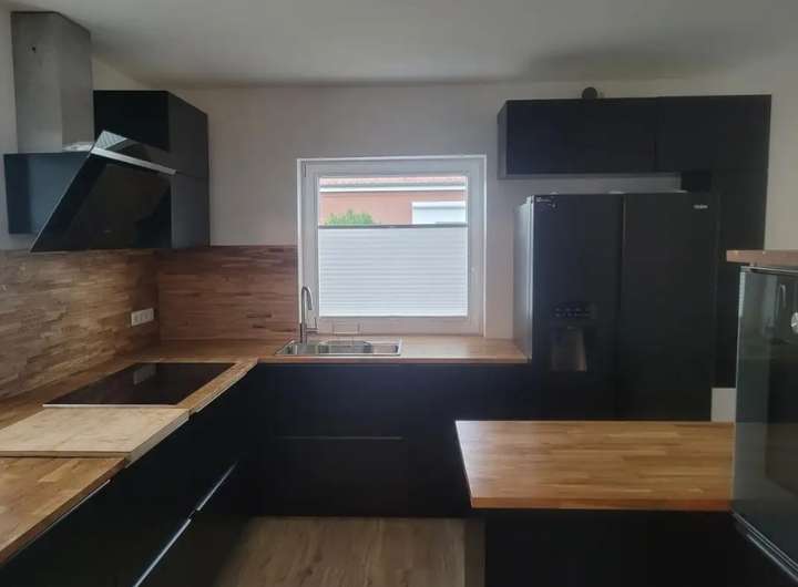 Geräumige Küche mit Side-by-Side Kühlschrank (m. Wasseranschluss), Induktionskochfeld und hochwertigem Backofen (Gaggenau).