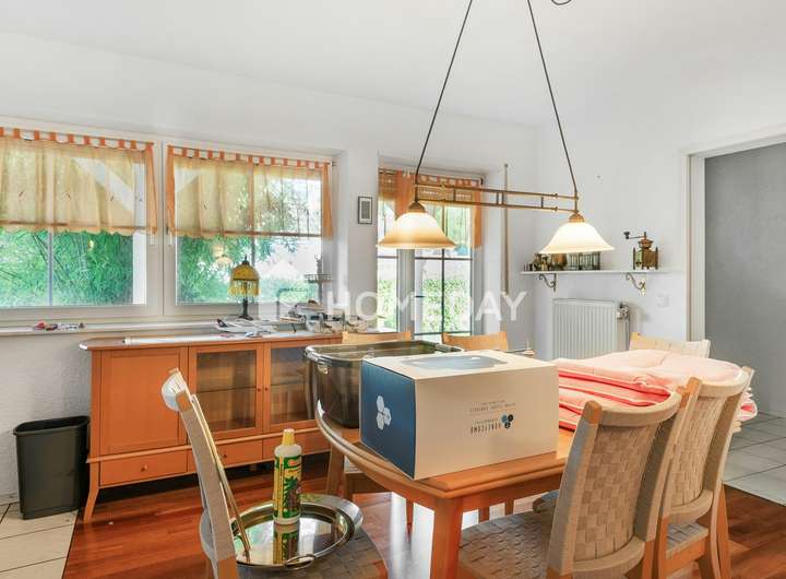 Das im Jahr 1993 errichtete Einfamilienhaus begeistert durch seine außergewöhnliche Architektur, die für Understatement und zugleich viel Wohnkomfort steht. Das Erdgeschoss wurde als Fertighaus in Holzständerbauweise und das Untergeschoss massiv errichtet. Auf einem etwa 781 Quadratmeter großen Grundstück gelegen, bietet das Haus rund 200 Quadratmeter Wohnfläche, verteilt auf sechs großzügige Zimmer. Neben der Hauptwohnung befindet sich im Kellergeschoss eine separate Einliegerwohnung, die zusätzlichen Wohnraum schafft.
