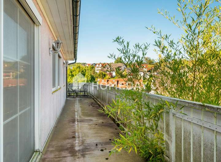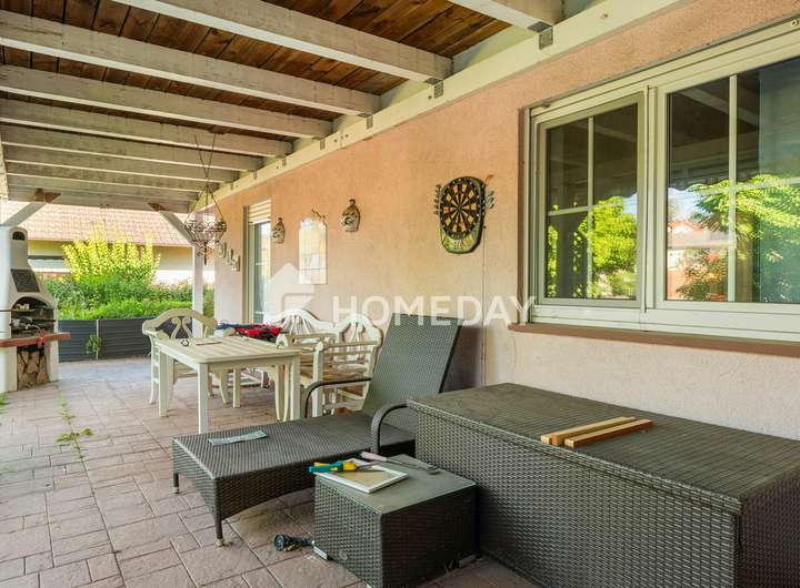Der Außenbereich ist harmonisch gestaltet und pflegeleicht angelegt. Die weitläufige Terrasse mit rund 40 Quadratmetern, ein Balkon mit etwa 17 Quadratmetern sowie ein idyllischer Gartenteich machen das Grundstück zu einer echten Oase. Eine Garage und ein Stellplatz im Freien runden das Angebot ab.