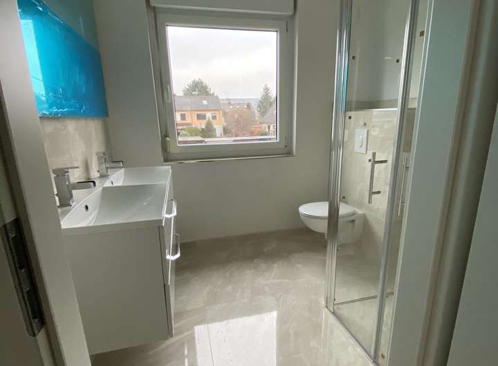 - Modernes Badezimmer mit: bodengleicher Dusche,Doppelwaschbecken inkl. Unterschrank, großem, beleuchtetem Wandspiegel, Separates Gäste-WC mit hochwertigen Sanitärobjekten
