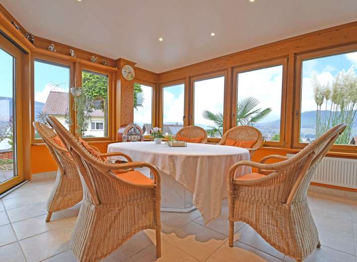 • Offener Wohn-Essbereich mit Wintergarten und Kamin