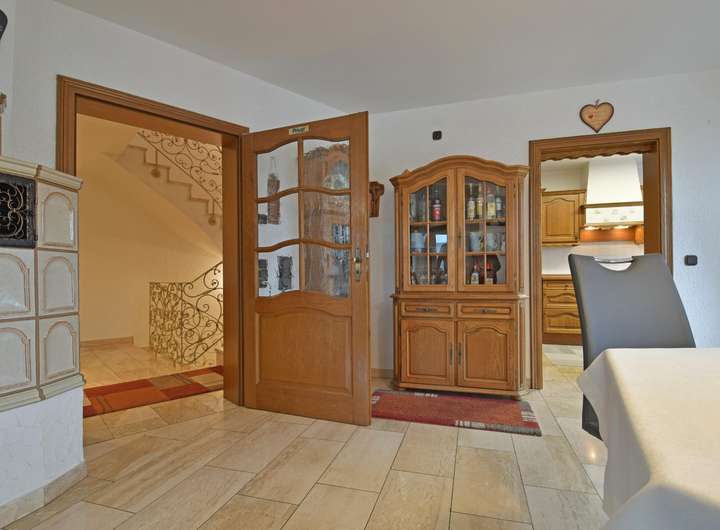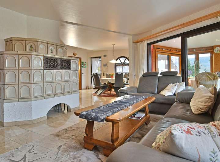 Die Hauptwohnung erstreckt sich über vier Ebenen und beeindruckt mit einem großzügigen Wohn-Essbereich, gemütlichem Kachelofen, Wintergarten, Terrasse, mehreren Schlafzimmern mit eigenem Bad und einem Studio mit Balkon.