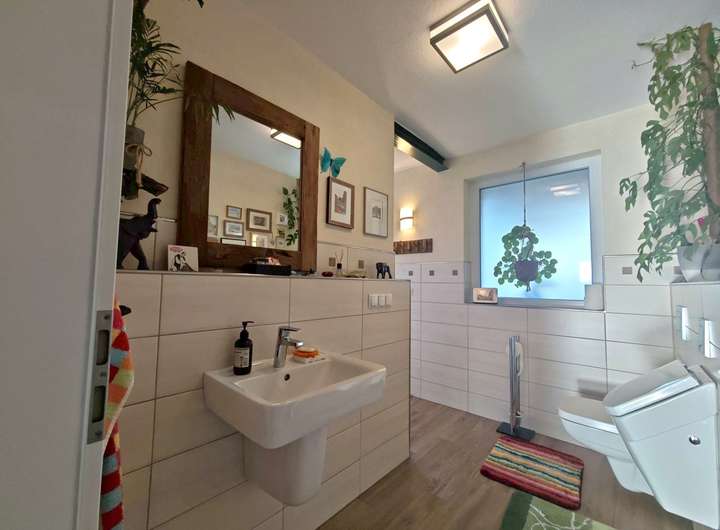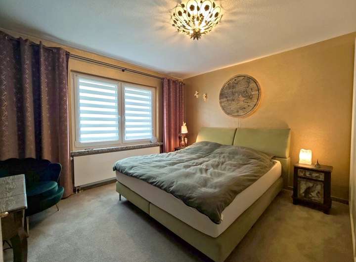 Dieses gemütliche, gepflegte und lichtdurchflutete Ein-/Zweifamilienhaus in Massivbauweise besticht durch seine moderne technische Ausstattung und seinem großzügigem Platzangebot. Der Zutritt zum Grundstück erfolgt über einen gepflasterten und von Beeten besäumten Weg zum großzügig dimensionierten und nördlich ausgerichteten Vorbau direkt ins Erdgeschoss und zugleich in das angrenzende Treppenhaus. Von hier aus gelangen Sie direkt in die modern aufgeteilte 3-Zi.-Wohnung mit offen gestaltetem Wohn-, Ess-, Koch- und Garderobenbereich in Größe von insgesamt ca. 120 m² Wohnfläche inklusive mediterran gestalteter Südterrasse, hochwertiger Einbauküche und einem großen, modernen Bad. Das große Schlafzimmer bietet Ihnen durch geschickte Möblierung einen separaten Ankleidebereich. Im daneben befindlichen Büro kann ein Home-Office, ein Gäste- oder ein Kinderzimmer als dauerhaftes oder temporäres Nutzungskonzept realisiert werden.