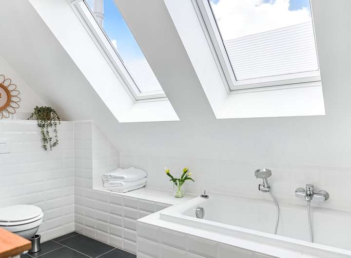 -Tageslichtbad mit Badewanne, Dusche und großem Fenster