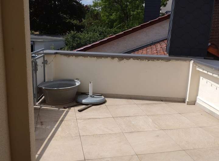 große Terrasse mit Blick ins Grüne Tageslichtbad