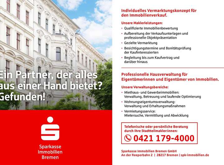 Das Einfamilienhaus liegt im schönen und familiären Bremen-Farge in einer ruhigen Sackgasse, die überwiegend durch weitere Einfamilienhäuser geprägt ist. In der Nähe befinden sich Einkaufsmöglichkeiten, Einrichtungen des täglichen Bedarfs, Kindergarten, Schule bis zur 5. Klasse und im Umkreis von ca. 2 km weiterführende Schulen. Ob Richtung Bremen, Lemwerder, Oldenburg oder Berne: Durch die Nähe an die A270 und die Fähre Farge-Berne erreichen Sie unkompliziert Ihr Ziel. Als öffentliche Verkehrsmittel stehen Ihnen der Bus sowie die Bahn zur Verfügung.