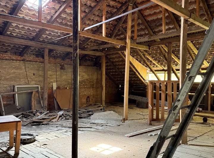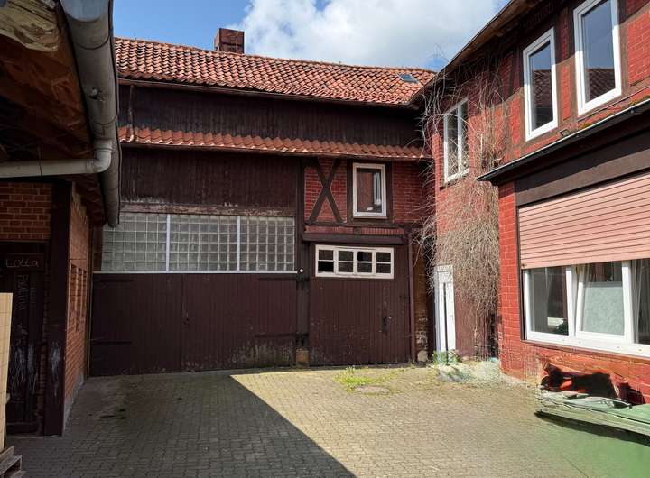 Direkt daneben befindet sich eine massive Halle, die sich hervorragend für den Umbau in drei bis vier Eigentumswohnungen eignet. Auch eine Nutzung mit Garagen im Erdgeschoss ist denkbar. Die Substanz der Halle ist solide, was vielfältige Nutzungsmöglichkeiten eröffnet.