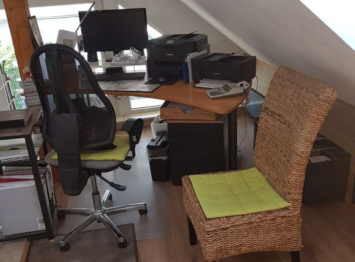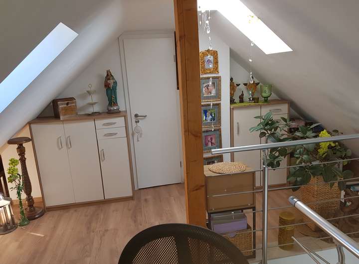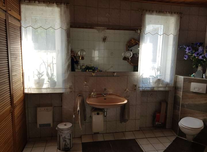 Fliesen, Laminat, Küche, Einbauschränke, Kaminofen, Eckbadewanne, Bürotisch