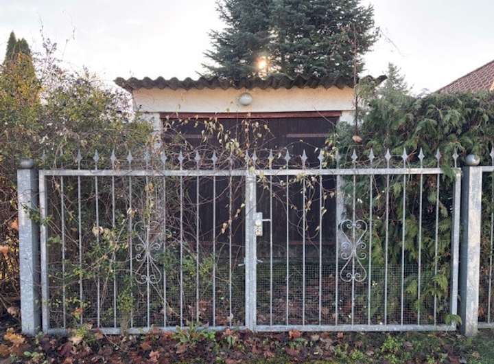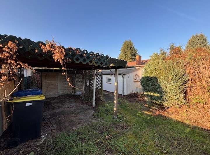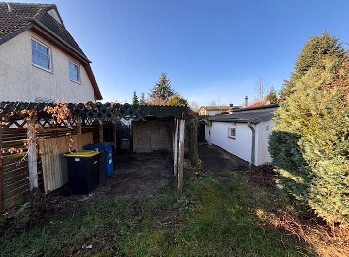 Auf der offiziellen Zufahrt steht eine Garage aus DDR-Zeiten, die trocken ist und sich mit etwas Einsatz wieder gut nutzen lässt. Gleiches gilt für den Unterstand am hinteren Grundstücksrand.