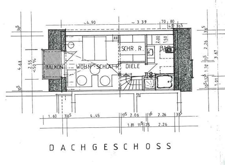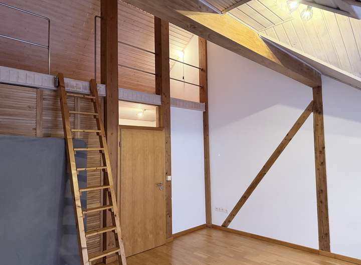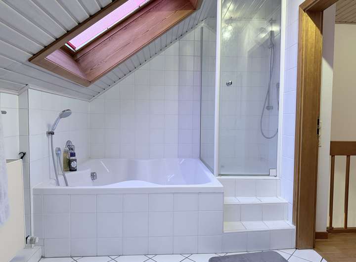 Im Obergeschoss befindet sich das Schlafzimmer mit Zugang zum Balkon sowie ein geräumiges Tageslichtbad mit Dusche, Badewanne und zwei Fenstern. Die offene Dachkonstruktion verleiht den Räumen zusätzlichen Charme.