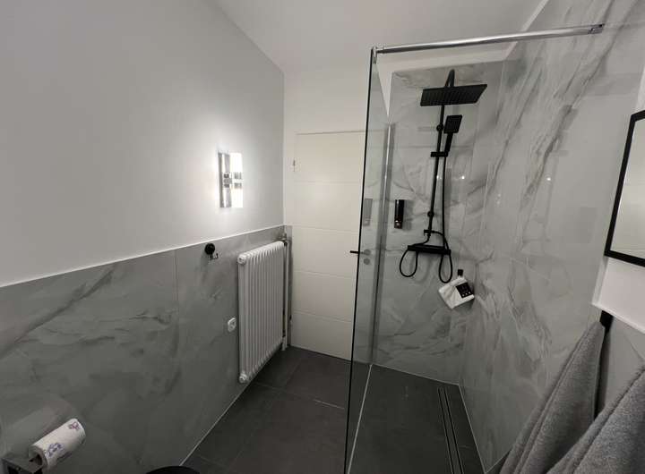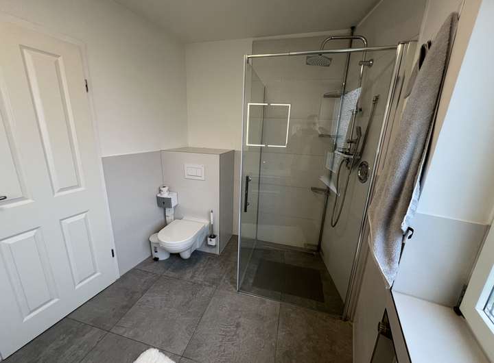 Schlafzimmer (ca. 27 m²) mit angrenzendem Duschbad (inkl. WC) und Waschbecken. Im