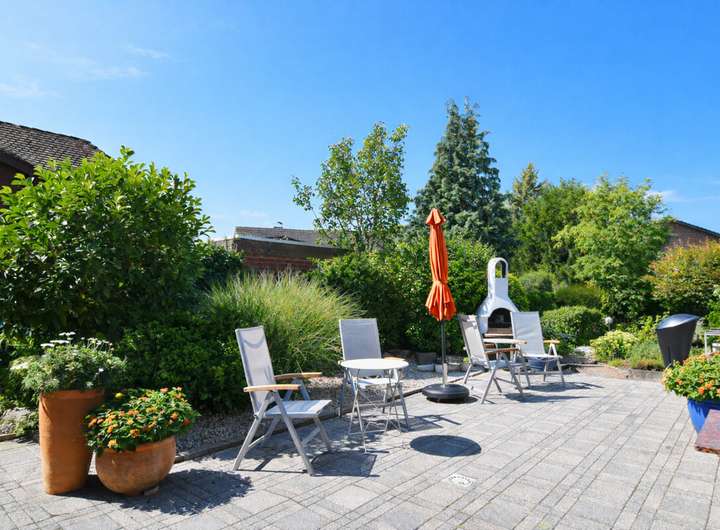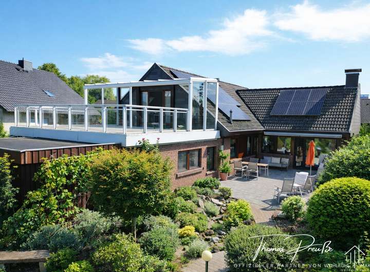 Das Erdgeschoss präsentiert sich hell und einladend: Große Fensterflächen lassen viel Tageslicht herein und ermöglichen zugleich mehrere Zugänge zur weitläufigen Terrasse und in den gepflegten Garten. Mittelpunkt ist der offene Wohn- Ess- und Loungebereich mit Kamin. Das 2017 modernisierte Tageslichtbad mit bodengleicher Dusche und großzügiger Eckbadewanne präsentiert sich zeitgemäß. Ein Schlafzimmer mit Ankleide, eine Einbauküche, ein Gästezimmer und Gäste-WC sowie eine praktische Hobbyküche runden das Raumangebot ab. Für behagliche Wärme sorgt die Flüssiggasheizung aus dem Jahr 2017. Zusätzlich punktet die Immobilie mit einer Photovoltaikanlage (5,886 kWp) sowie einer Wallbox für Elektrofahrzeuge nebst Außenstellplätzen.