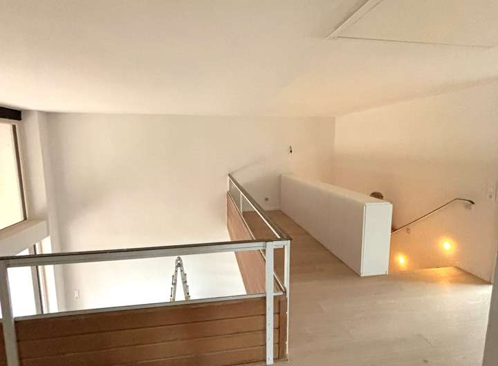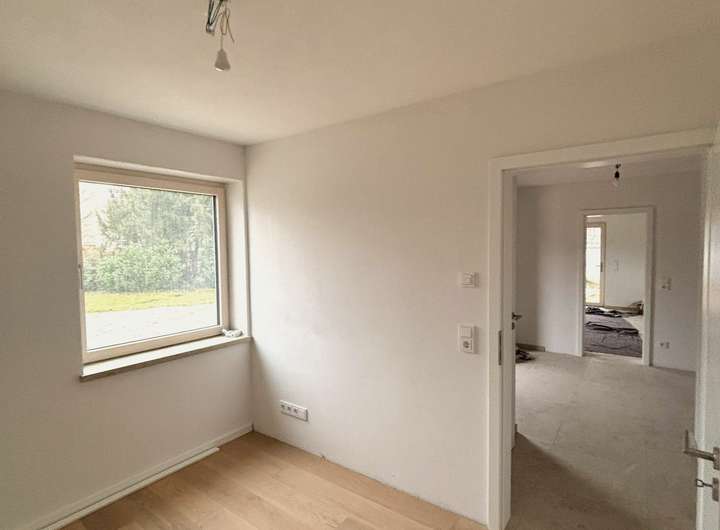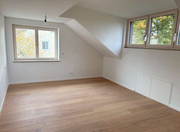 Ein besonderes Juwel des Hauses ist der zentrale Wohnraum, der bis zum Dach geöffnet ist und mit bodentiefen Fenstern sowie seiner offenen Galerie in den ersten Stock das Herzstück des Hauses bildet. Angrenzend liegt die Küche mit nebenliegendem Hauswirtschaftsraum, welcher vom Mieter nach eigenem Geschmack selbst gestaltet werden kann. Im Obergeschoss des Hauses befinden sich drei helle Schlafräume mit Balkon und einem großen Bad. Haustiere sind nach Absprache erlaubt.