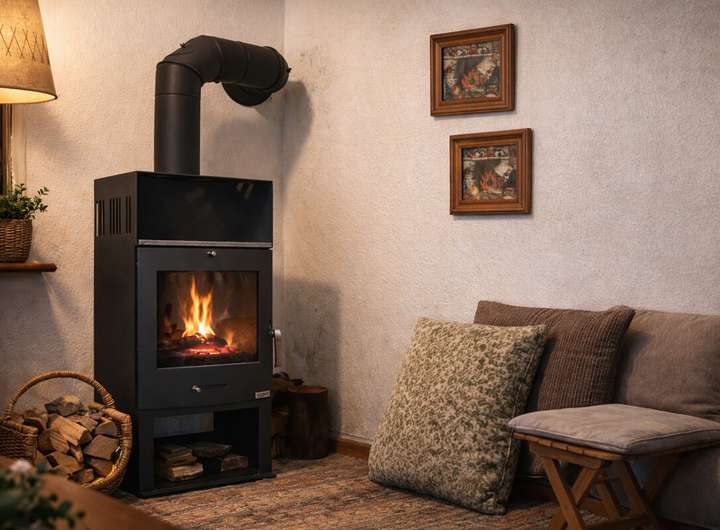 Das lichtdurchflutete Wohnzimmer mit integriertem Holzofen sorgt für eine behagliche Atmosphäre und bietet direkten Zugang zur überdachten Terrasse.