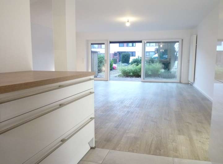 Der großzügige Wohn- und Essbereich öffnet sich zum ruhig gelegenen Garten, der bis in die Abendstunden hinein von der Sonne verwöhnt wird.