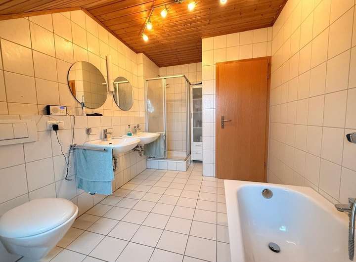 Sanitär: Tageslichtbad mit Dusche und Badewanne sowie ein separates Gäste-WC mit Fenster.