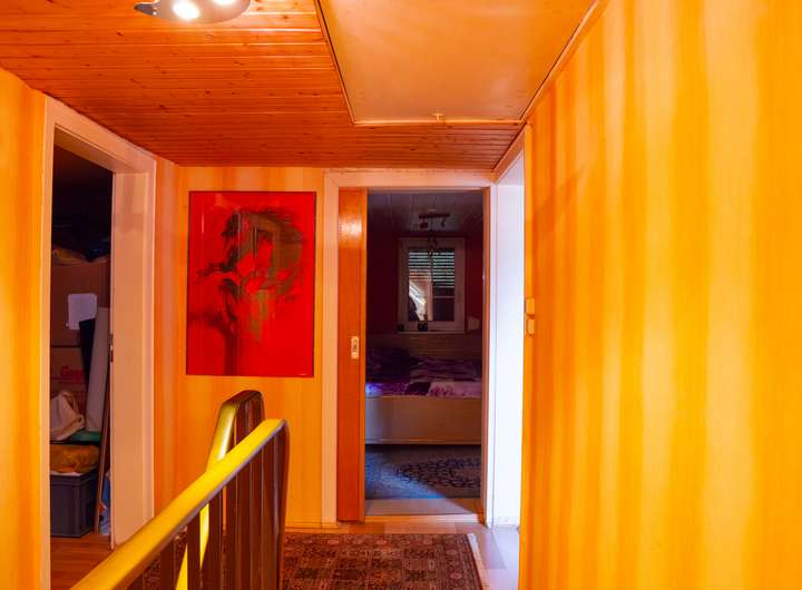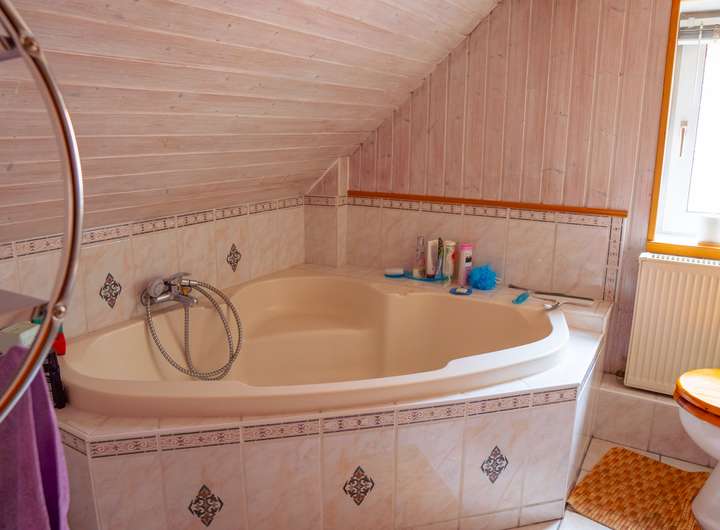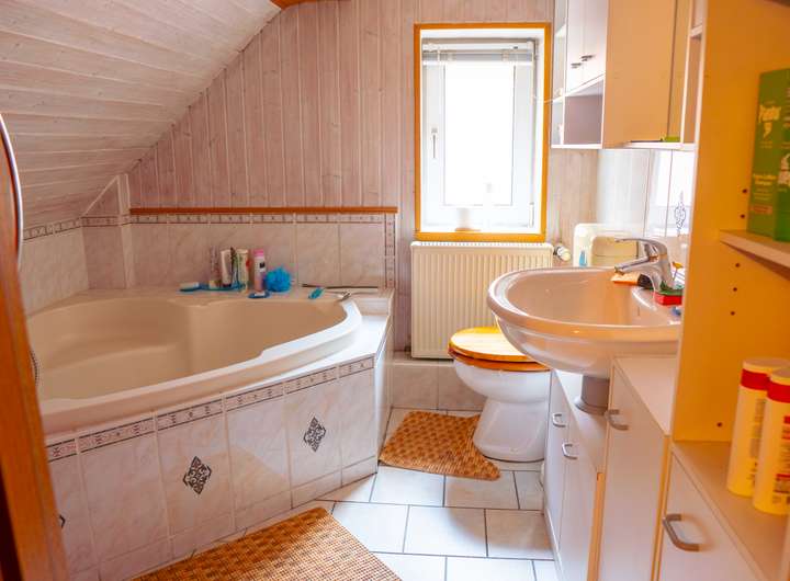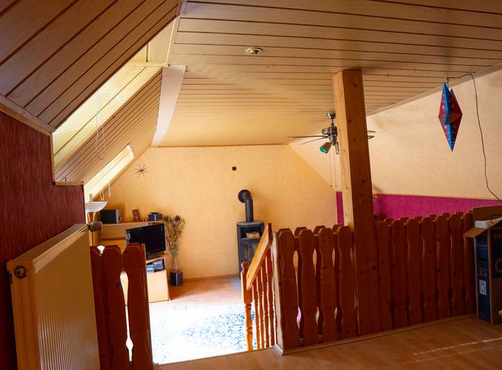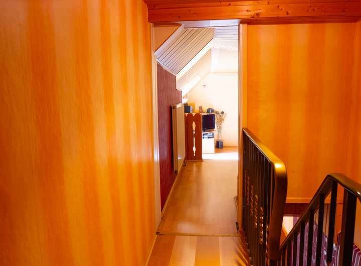 Im Obergeschoss erwartet Sie ein Schlafzimmer mit angrenzendem Badezimmer, ausgestattet mit einer Badewanne – ideal für entspannende Wellness-Momente. Darüber hinaus finden Sie ein Kinderzimmer, ein Ankleidezimmer sowie ein großes Wohnzimmer mit Kamin. Diese variabel nutzbaren Räume bieten zahlreiche Gestaltungsmöglichkeiten für Kinder, Gäste oder als zusätzliches Arbeitszimmer.