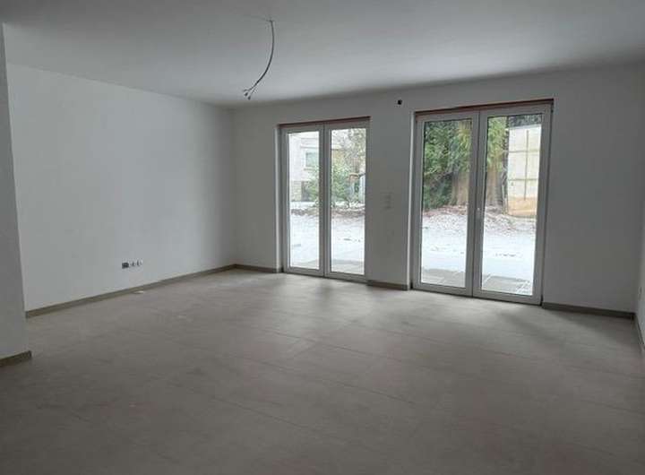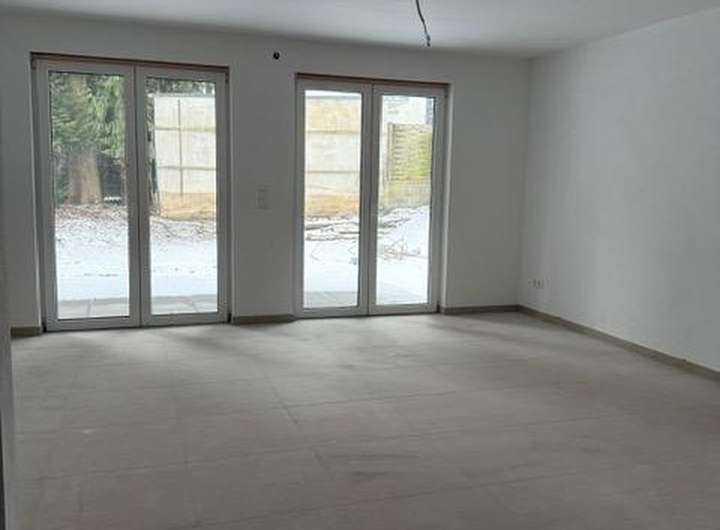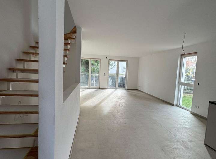 Offener Wohnbereich mit bodentiefen Fenstern, Abstellraum, Technikraum, Tageslichtbad mit Dusche sowie Zugang zur ca. 15 m² großen Terrasse und privatem Gartenanteil von ca. 100 m².