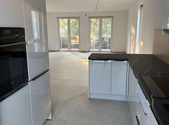 Großzügiger Wohn- und Essbereich mit Zugang zum Südwest-Balkon (ca. 5 m²), offener Küchenbereich mit bereits verbauter Designküche inkl. Siemens StudioLine Premium-Geräten sowie Gäste-WC.