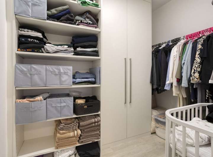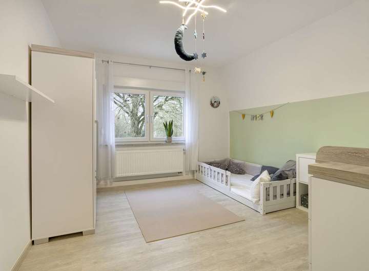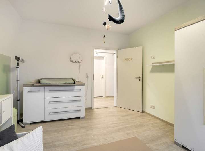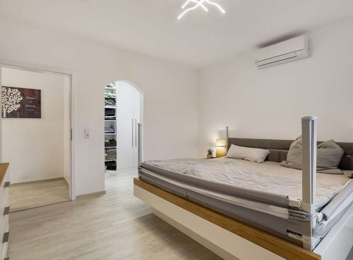 Gegenüber liegt das 15 m² große Kinderzimmer, während am rechten Ende des Flures das 16 m² große Schlafzimmer mit angrenzendem begehbarem Kleiderschrank und einer modernen Klimaanlage zu finden ist.