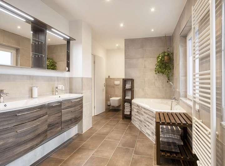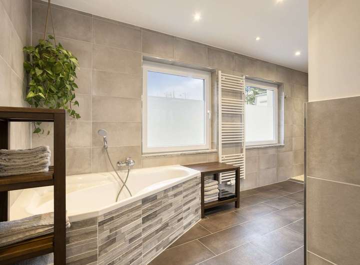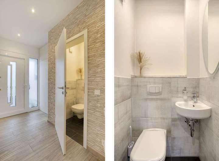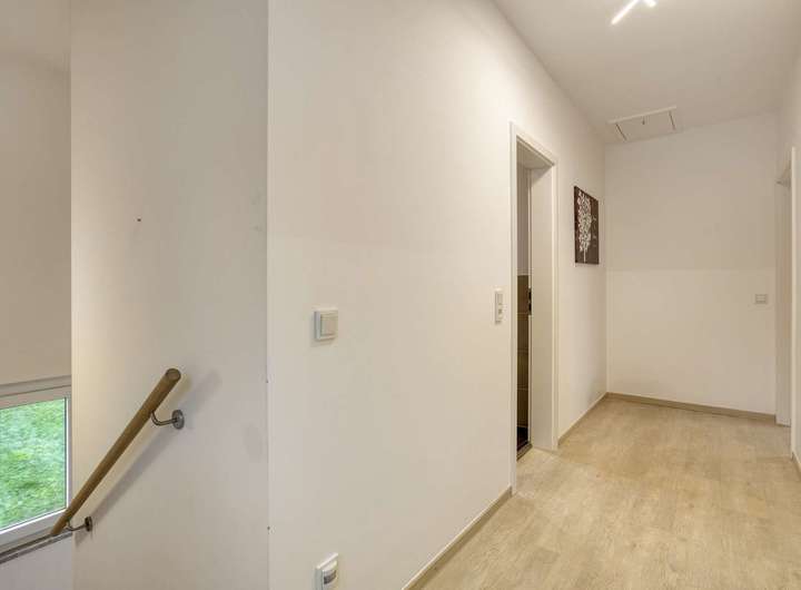 Ergänzt wird das Erdgeschoss durch ein modernisiertes Gäste-WC sowie einen funktionalen Abstellraum neben der Küche. Direkt daneben befindet sich die Treppe, die Sie in den Flur des Obergeschosses führt. Dort erwartet Sie zu Ihrer linken Seite ein großzügiges Tageslichtbad mit rund 13 m², ausgestattet mit einer bodentiefen Dusche, einem modernen Doppelwaschbecken und einem WC.