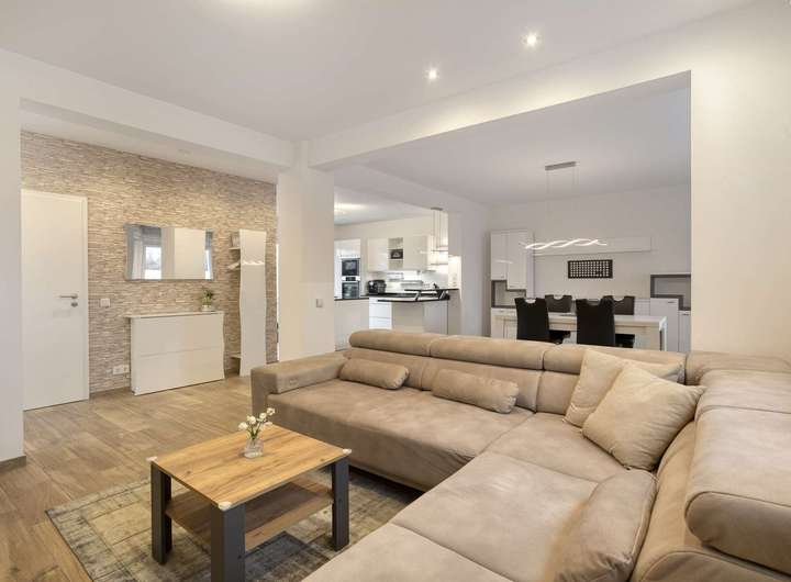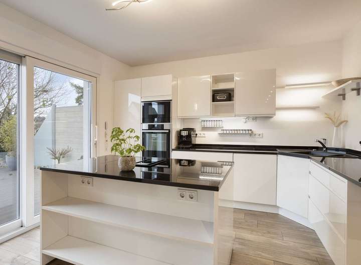 Die hochwertige Einbauküche stammt aus dem Jahr 2018, hatte einen Anschaffungspreis von rund 20.000 € und verfügt über eine Granitarbeitsplatte sowie Marken-Elektrogeräte. Dazu gehören ein Backofen und eine Mikrowelle der Marke Neff, ein Induktionsherd mit integriertem Dunstabzug der Marke Siemens sowie eine Geschirrspülmaschine der Marke Bosch aus dem Jahr 2020. Der Preis für die Übernahme der Küche beläuft sich auf 10.000 €.
