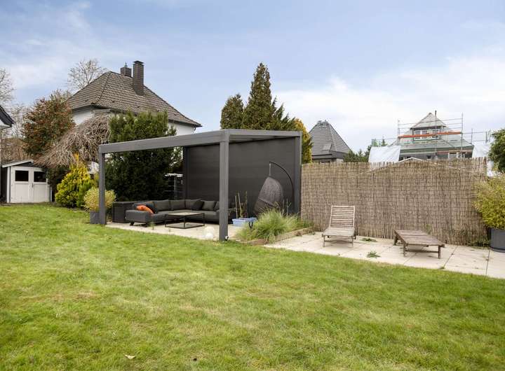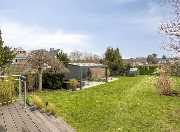 Die großzügige Terrasse wurde im Jahr 2020 neu angelegt und mit einer elektrischen Markise ausgestattet, die eine Fläche von 5 x 5 Metern überspannt. Der Garten bietet neben einer großzügigen Rasenfläche auch eine überdachte Pergola mit dimmbarer Beleuchtung & Außensteckdosen. Eine an der Rückwand der Fassade angebrachte Schlauchtrommel ermöglicht die komfortable Bewässerung des Gartens, während eine zusätzliche in der Garage für die weitere Bewässerung der Einfahrt vorhanden ist.