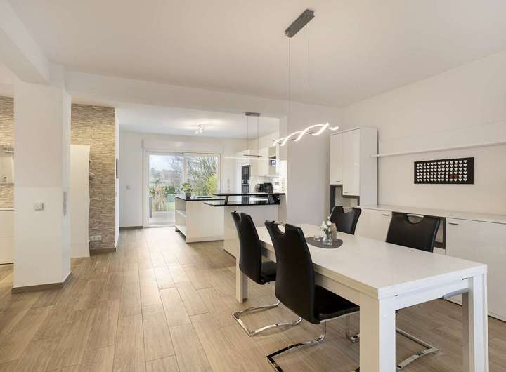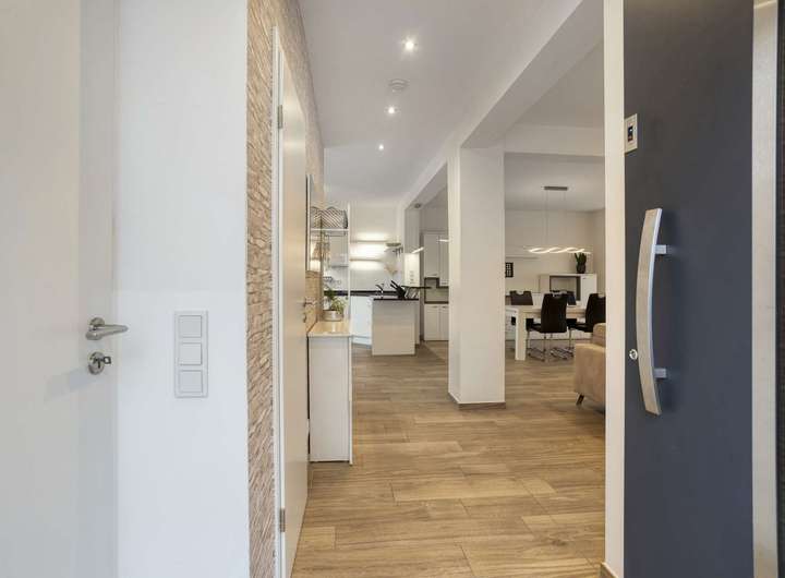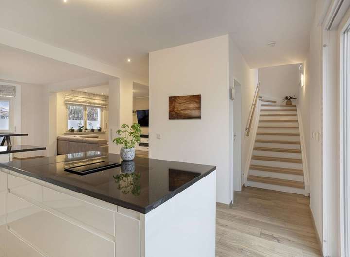Schon beim Betreten des Hauses empfängt Sie eine einladende Diele, die Ihnen auf direktem Wege Zugang zum Herzen des Hauses eröffnet: dem offenen Wohn-, Ess- und Kochbereich mit insgesamt rund 60 m². Die offene Raumgestaltung in Kombination mit der Fußbodenheizung und Klimaanlage sorgt zu jeder Jahreszeit für eine besonders einladende Wohnatmosphäre und dazu ein angenehmes Raumklima.