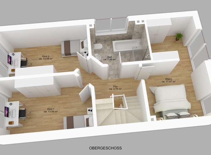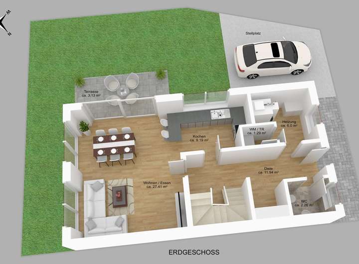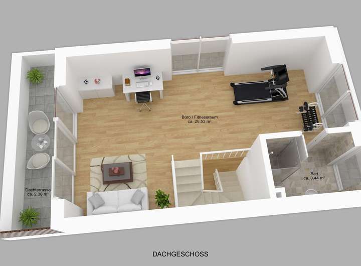 Großzügige fünf lichtdurchflutete Zimmer verteilen sich auf drei durchdacht gestaltete Etagen und bieten mit einer Gesamtwohnfläche von ca. 152 m² viel Raum für individuelles Wohnen, Arbeiten und Entspannen.