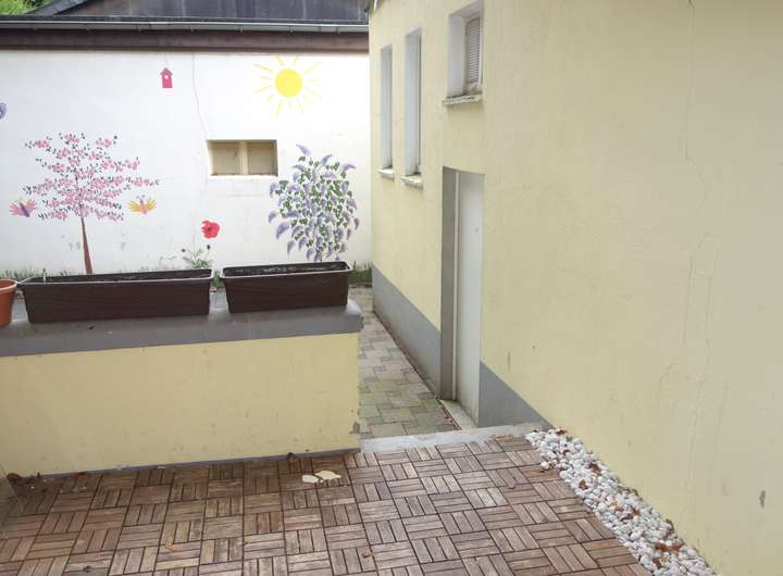 Von der großzügigen Wohnküche aus gelangen Sie auf die Terrasse sowie in den von Mauern geschützten Innenhof, der eine angenehme Rückzugsmöglichkeit bietet.