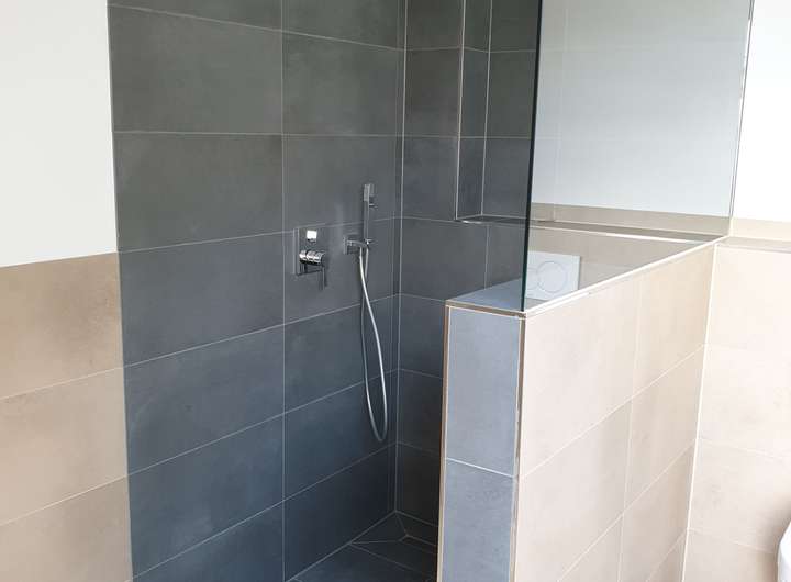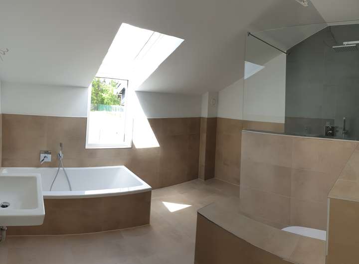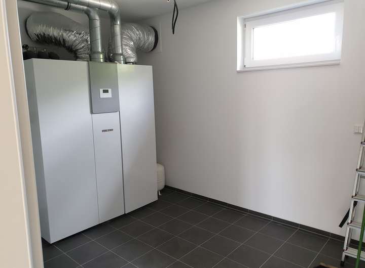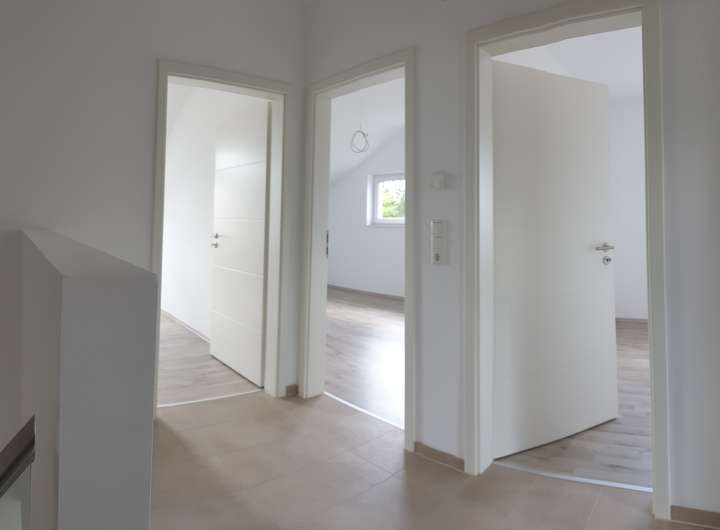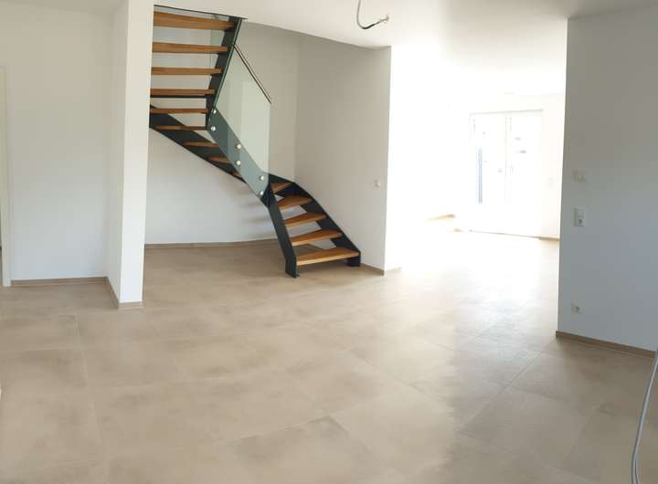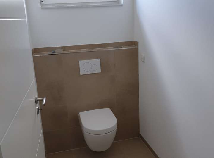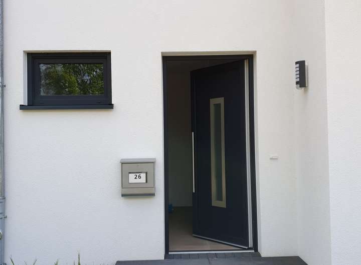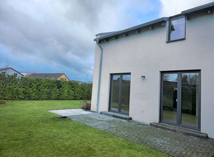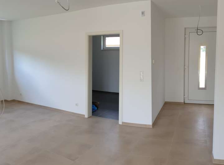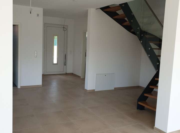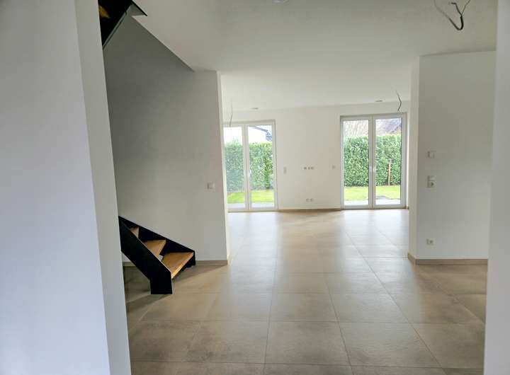 Wärmepumpe, Fußbodenheizung, bodengleiche Dusche, separate Badewanne, Gäste-WC, großformatige Fliesen, elektrische Rollläden, bodentiefe Fenster, Dreifachverglasung, Garten, Terrasse