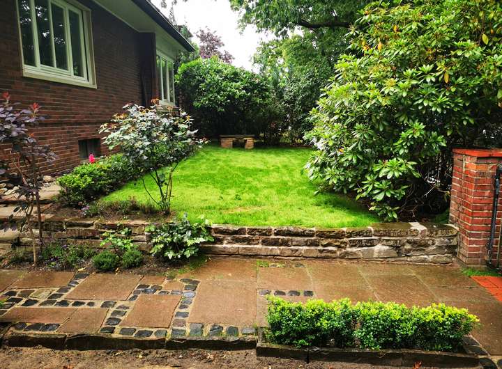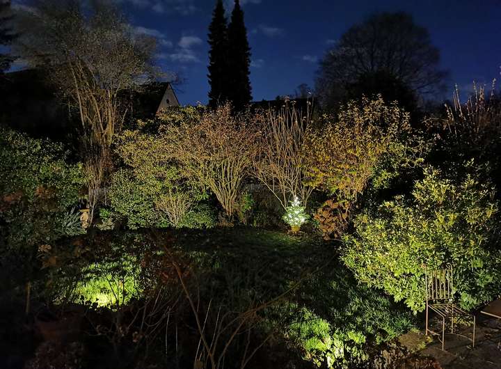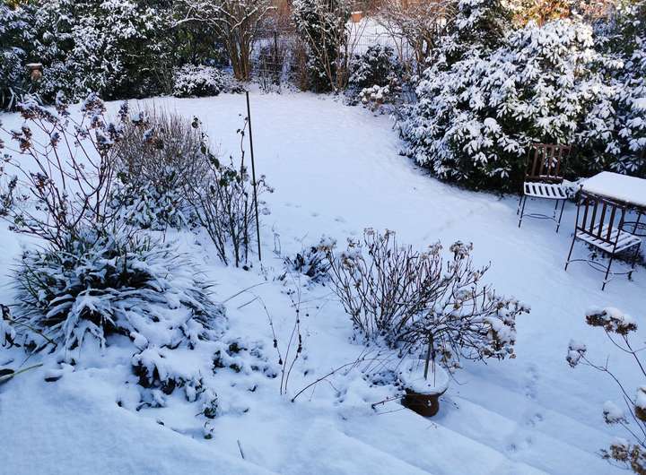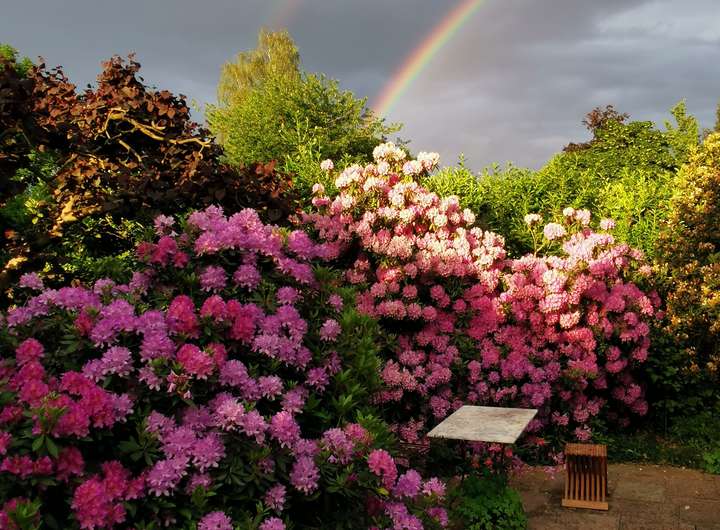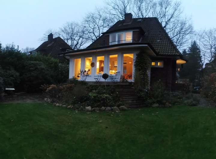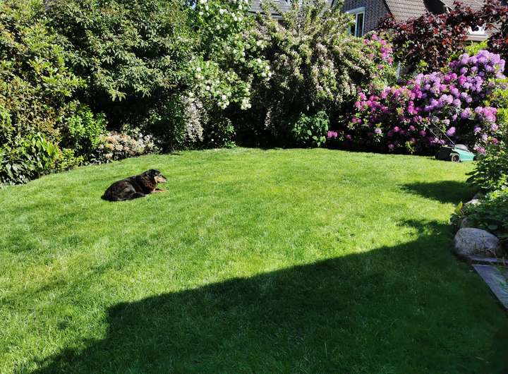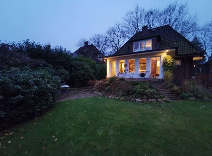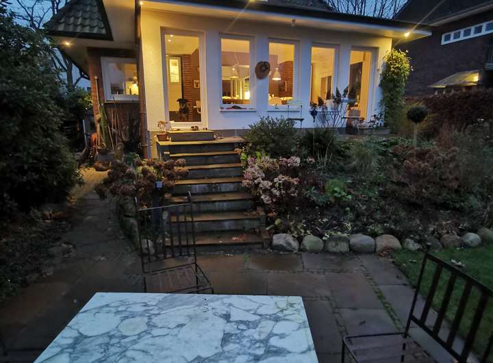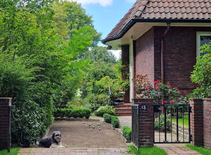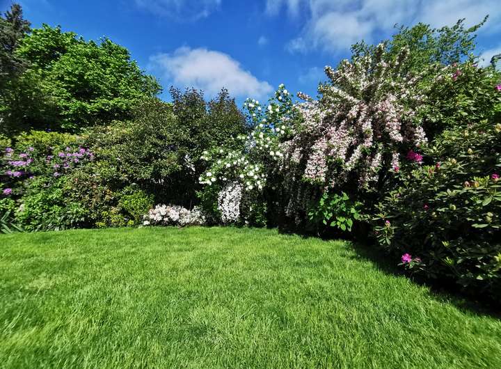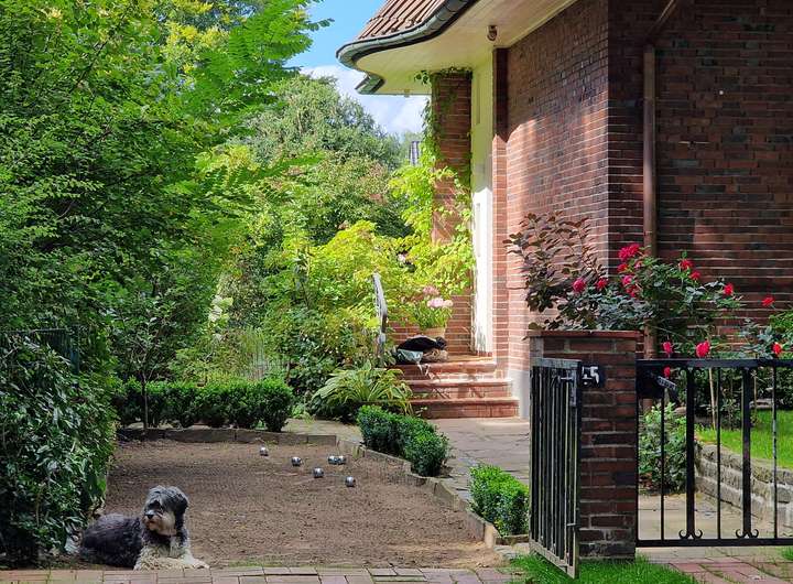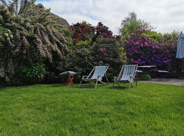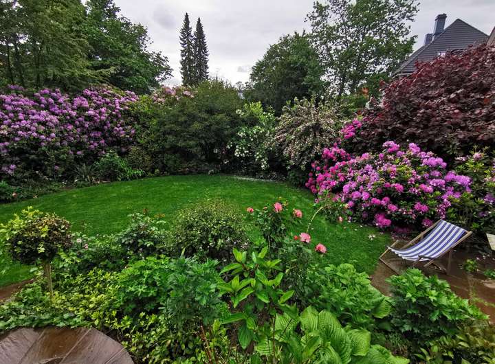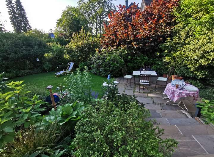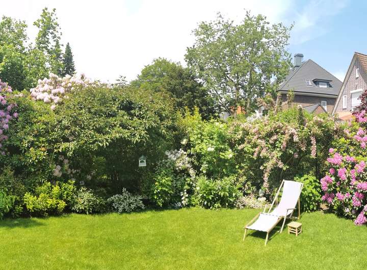 Der Garten ist liebevoll angelegt, blühend im Frühjahr mit Kamelie und riesigen Rhododendren, das ganze Jahr über voller Rosen und schon im Dezember wieder Winterschneeball und bald Weigelie. Eine obere Terrasse überblickt zusammen mit dem Esszimmer den Garten, eine untere neben dem prächtigen Rasen hat von morgens bis abends Sonne.