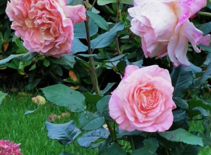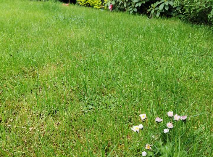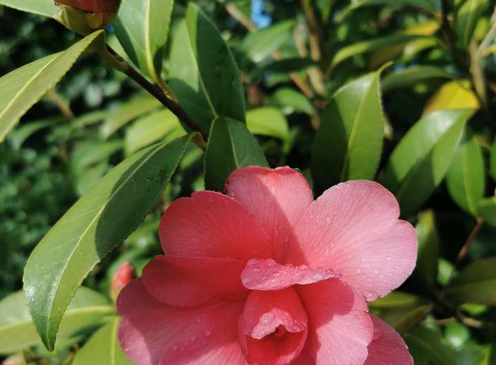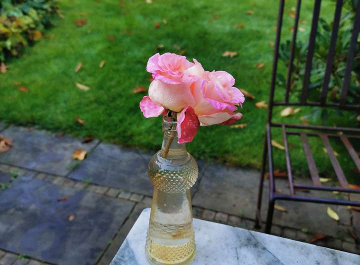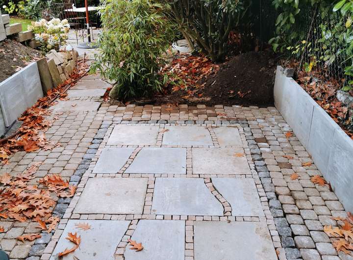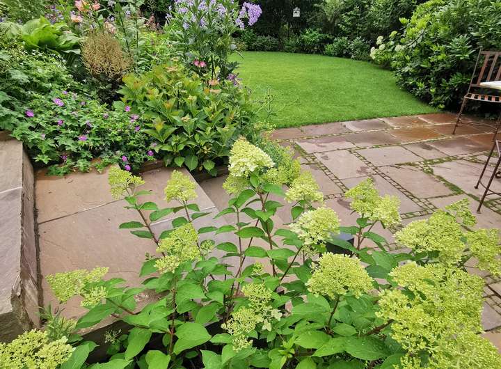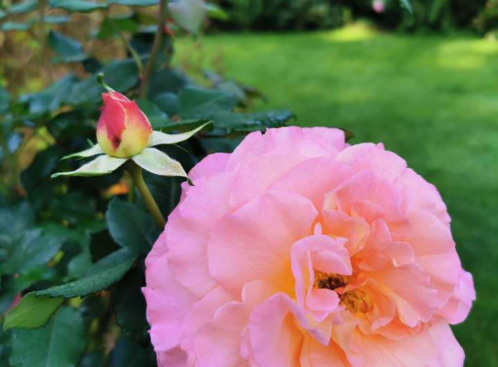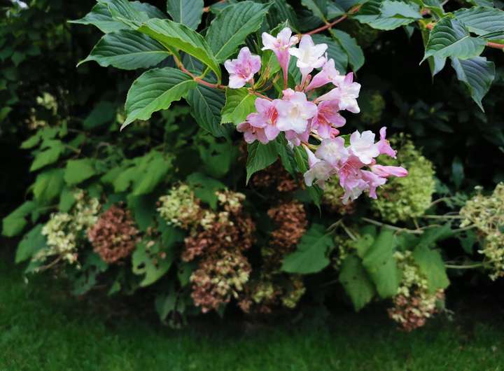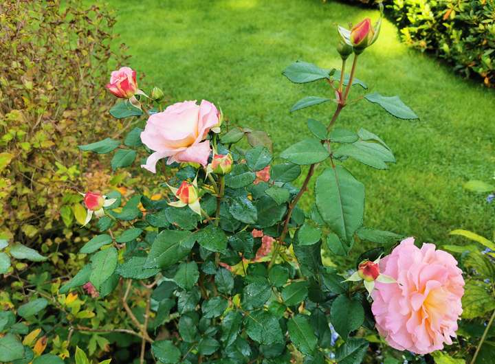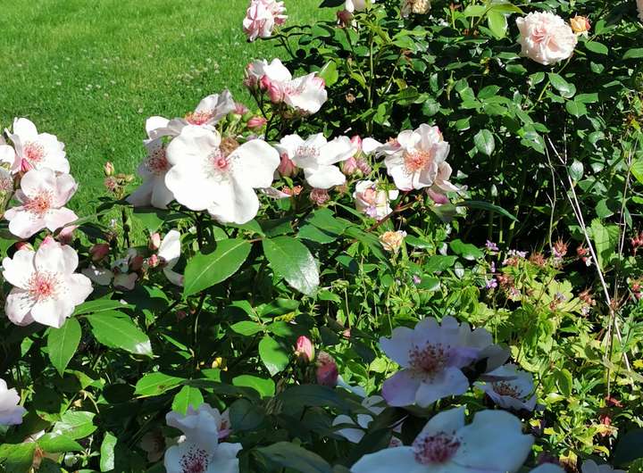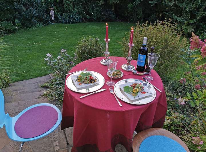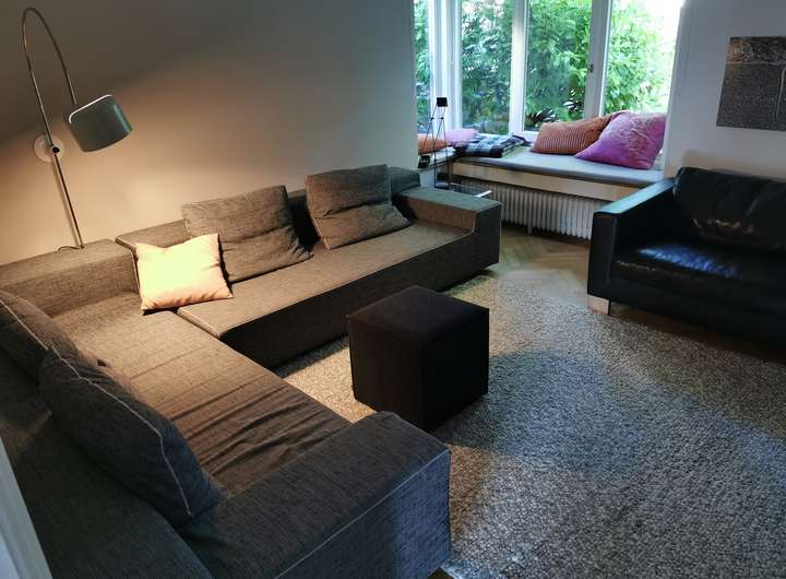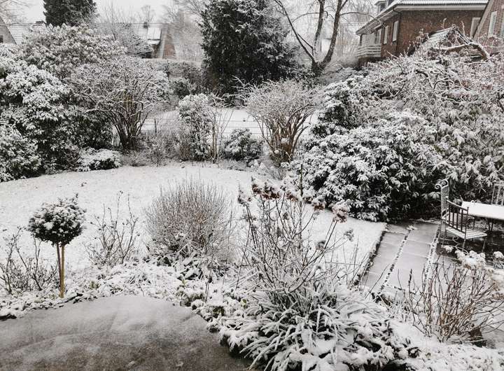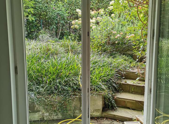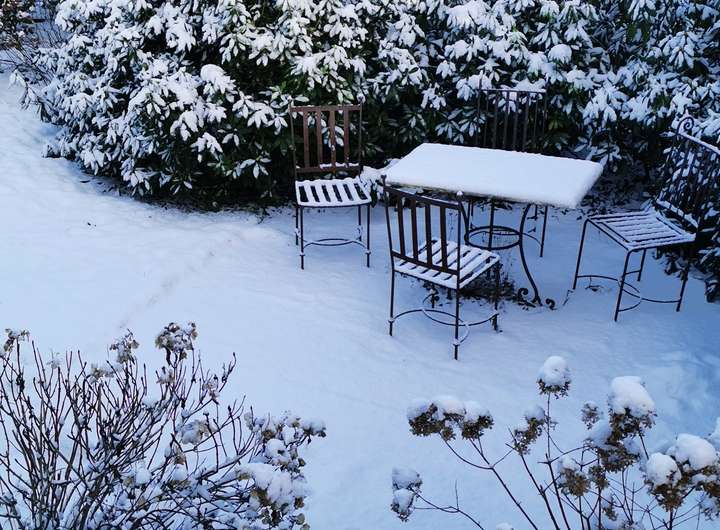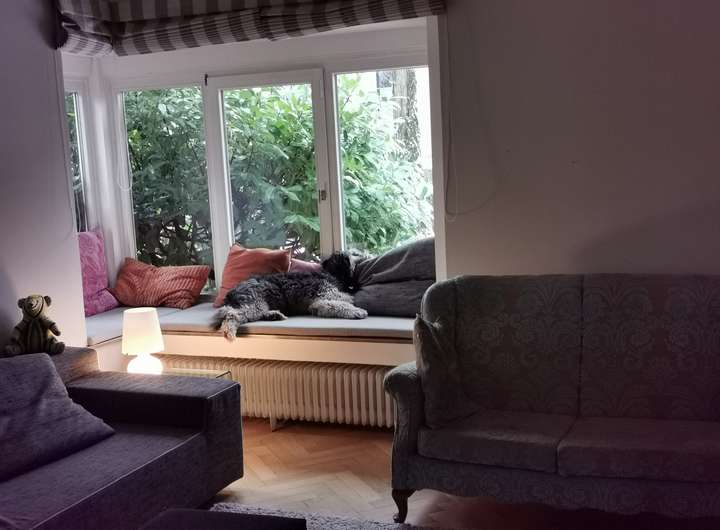 Der Garten ist liebevoll angelegt, blühend im Frühjahr mit Kamelie und riesigen Rhododendren, das ganze Jahr über voller Rosen und schon im Dezember wieder Winterschneeball und bald Weigelie. Eine obere Terrasse überblickt zusammen mit dem Esszimmer den Garten, eine untere neben dem prächtigen Rasen hat von morgens bis abends Sonne.
