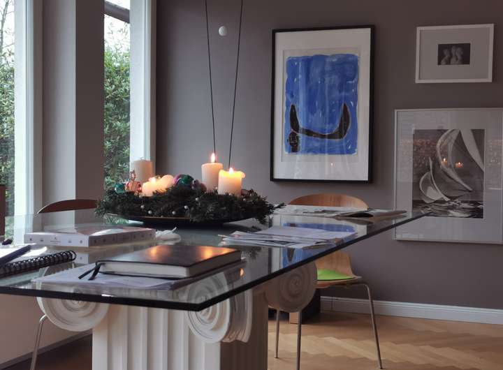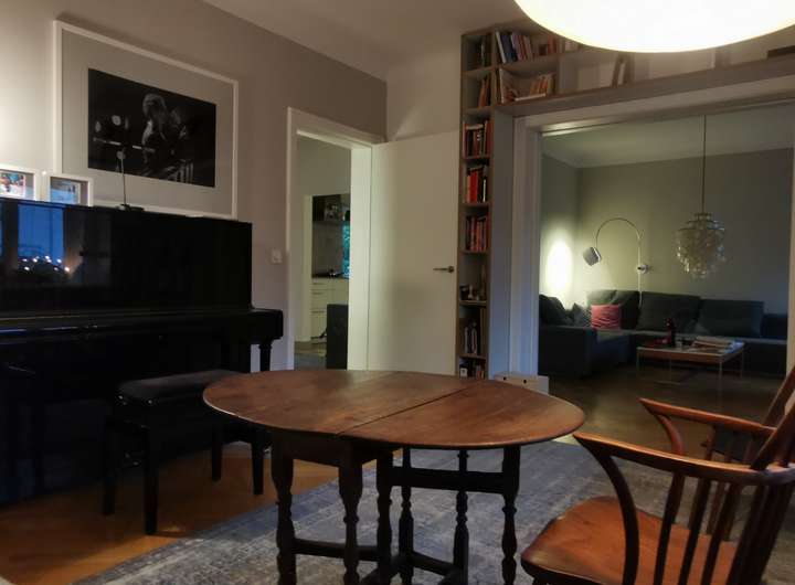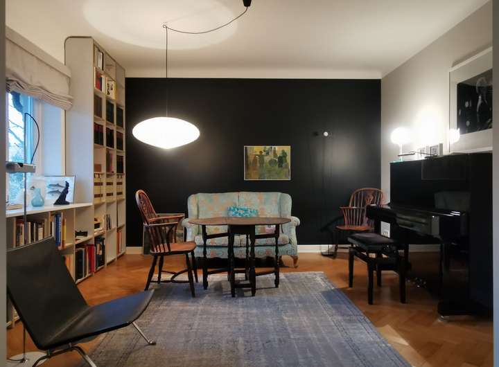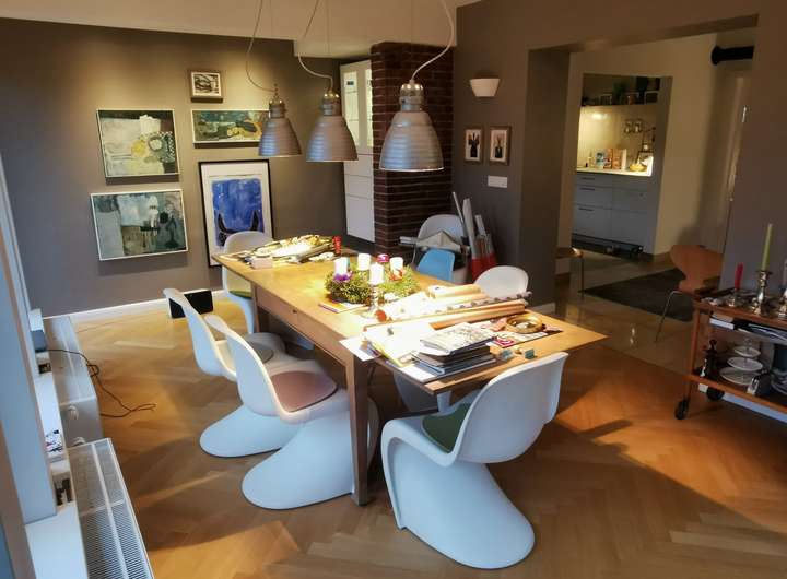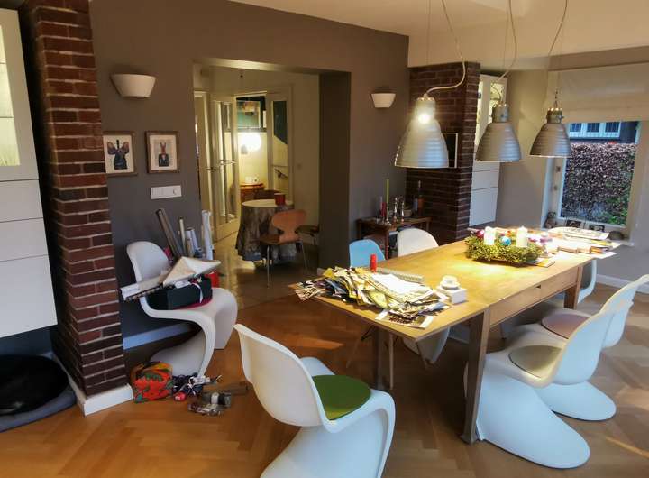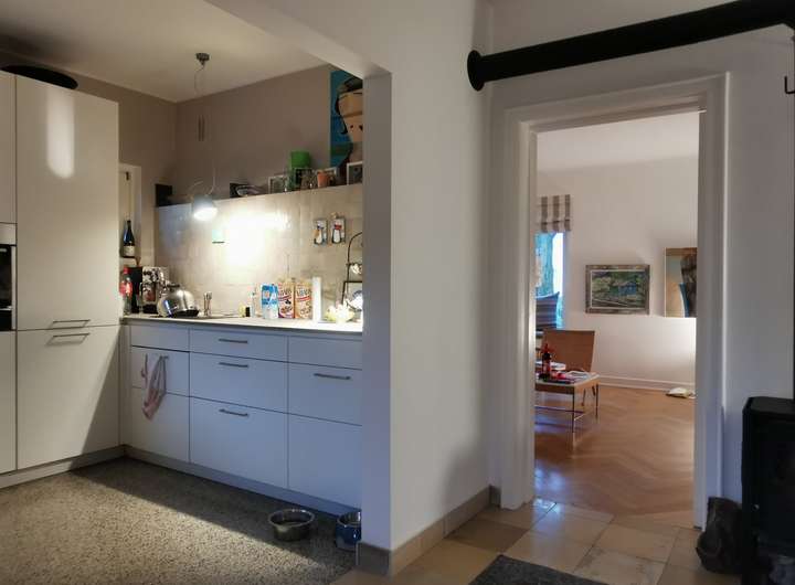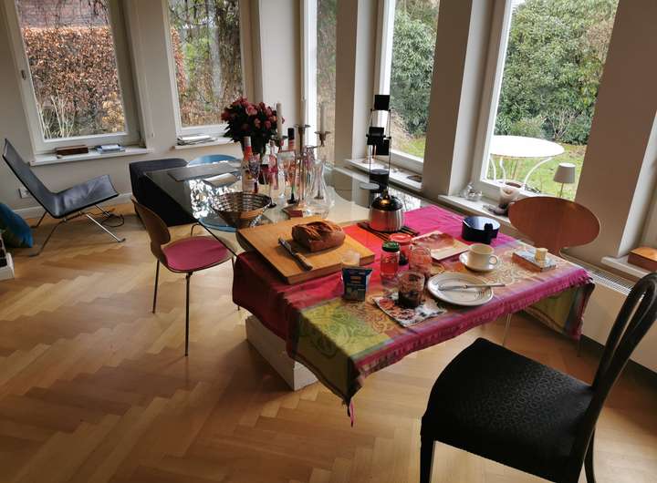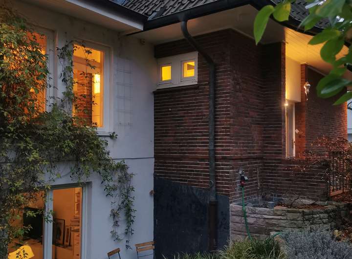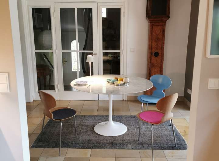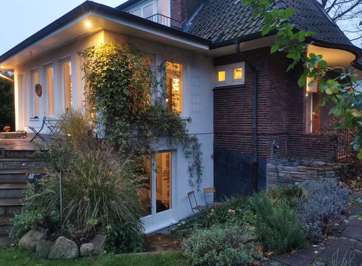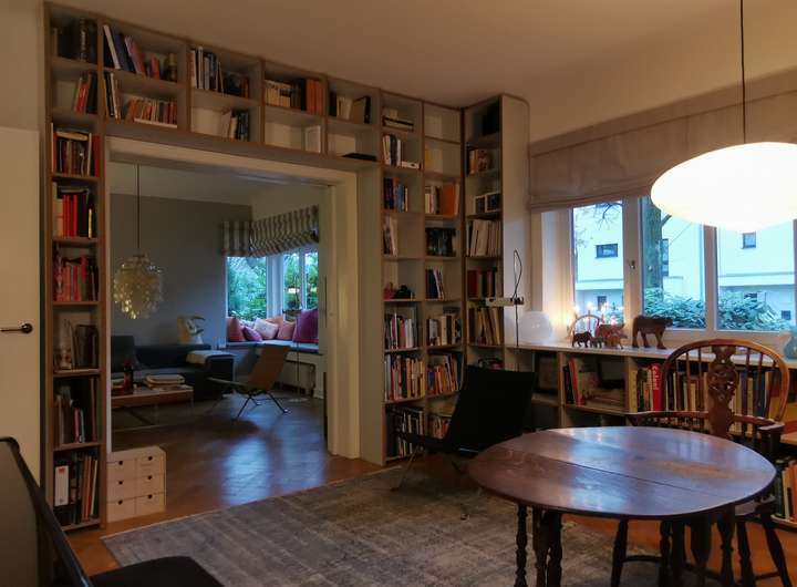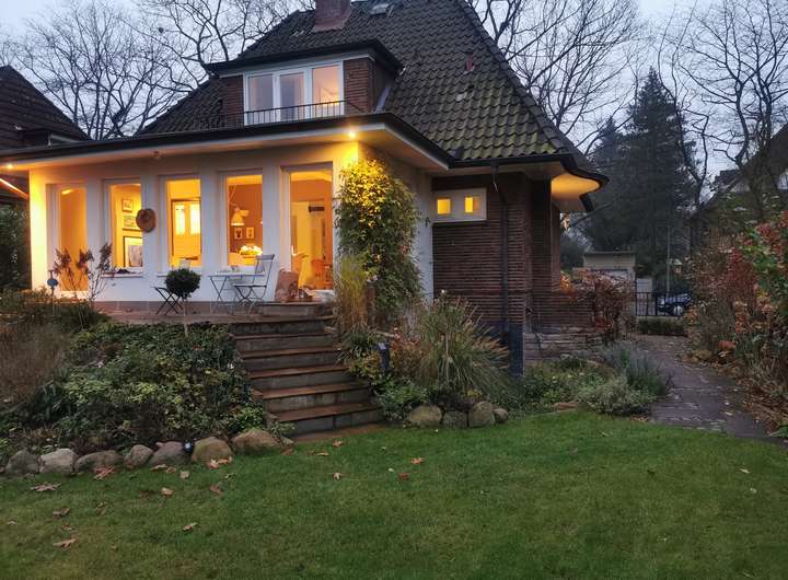 Das Haus wurde 1953 als Architektenhaus wohlproportioniert und schon original mit höchstwertigen Materialien wie Eichen-Fischgrätparkett, Solnhofener Sandstein und Terrazzo ausgestattet, und vom Eigentümer, einem Professor für Gestaltung, in allen Details sorgfältig renoviert und ergänzt. Die Armaturen von Vola stammen von Arne Jacobsen, Türklinken von Walter Gropius und Fenstergriffe von Manufactum sind vernickelt, Schalter von Gira und Farben von Farrow&Ball, Badfliesen sind Berliner Zementkacheln, die Küche mit Arbeitsplatten aus Granit kommt von der renommierten Hamburger Möbeltischlerei Hummel.