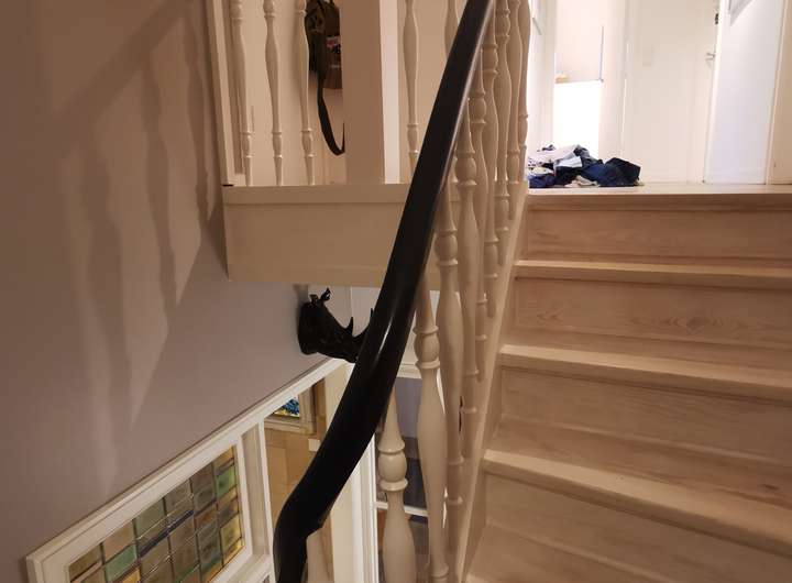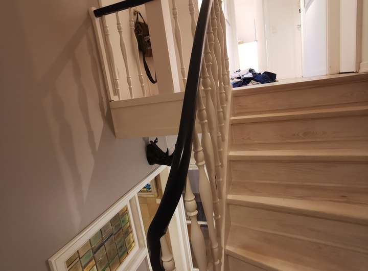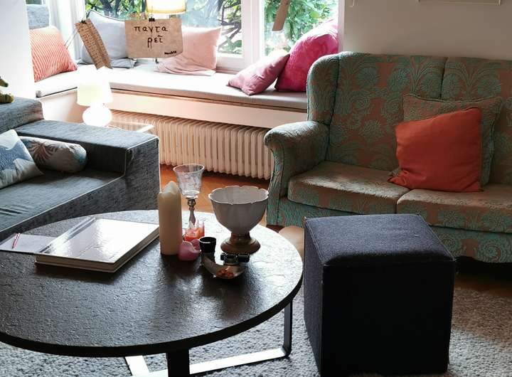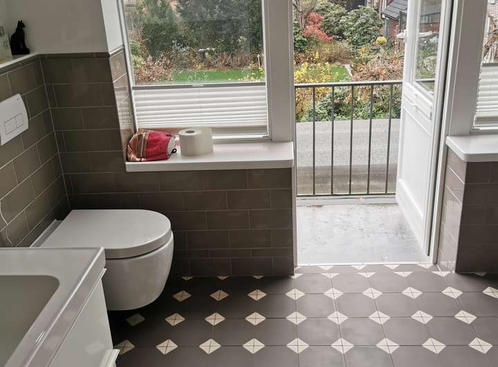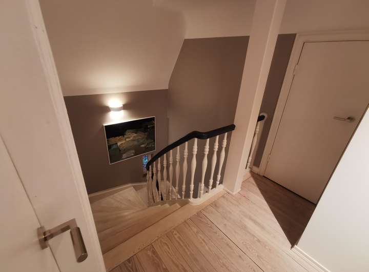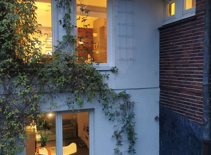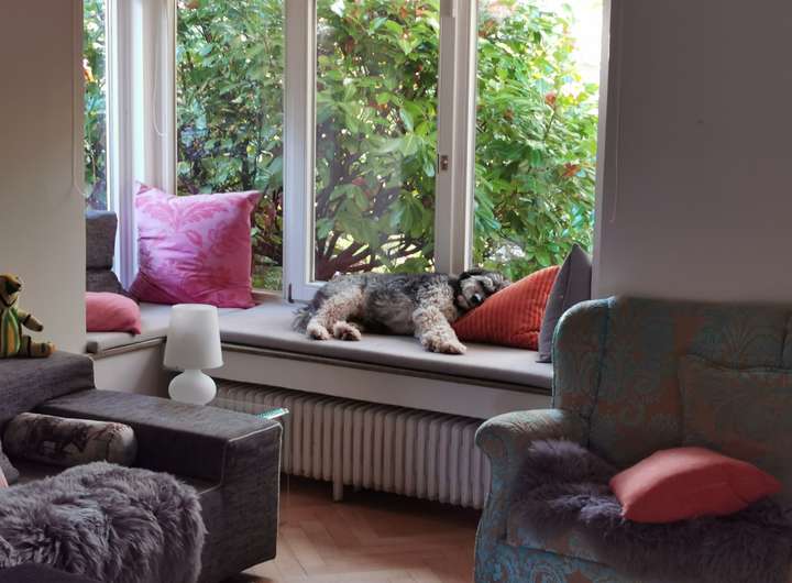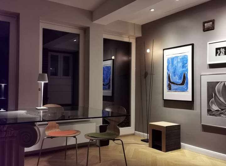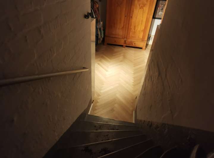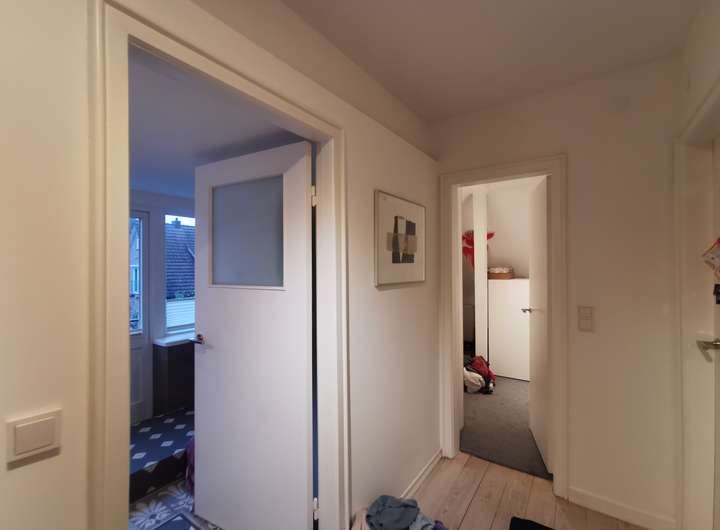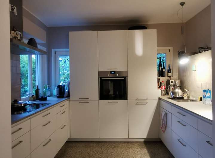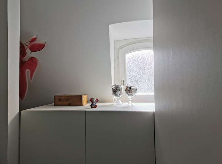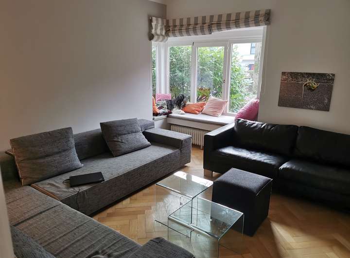 Das Haus wurde 1953 als Architektenhaus wohlproportioniert und schon original mit höchstwertigen Materialien wie Eichen-Fischgrätparkett, Solnhofener Sandstein und Terrazzo ausgestattet, und vom Eigentümer, einem Professor für Gestaltung, in allen Details sorgfältig renoviert und ergänzt. Die Armaturen von Vola stammen von Arne Jacobsen, Türklinken von Walter Gropius und Fenstergriffe von Manufactum sind vernickelt, Schalter von Gira und Farben von Farrow&Ball, Badfliesen sind Berliner Zementkacheln, die Küche mit Arbeitsplatten aus Granit kommt von der renommierten Hamburger Möbeltischlerei Hummel.
