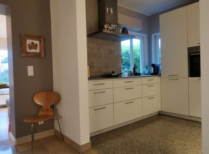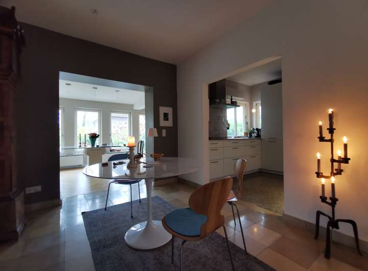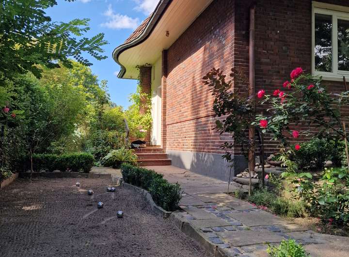 Das Haus bietet mit 7,5 Zimmern, 4 Schlafzimmern und 2 Badezimmern ein variantenreiches Zuhause. Für eine 5-köpfige Familie. Oder als Alterssitz mit Plegekraft. Oder schlicht für ein oder zwei Bewohner mit dem Wunsch nach ruhiger, stilvoller Umgebung voller Gestaltungsmöglichkeiten und großzügiger, perfekt dosierter Geräumigkeit. Ein Gäste-WC und ein Außenstellplatz sind vorhanden, ebenso eine Werkstatt und eine Boule-Bahn. Das Haus ist vollständig unterkellert.