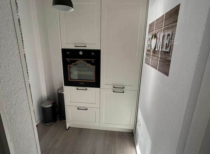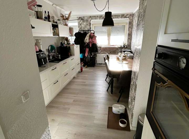 Er führt sowohl zum Treppenaufgang in das Obergeschoss, sowie zur Küche. In der Miete ist eine weiße Anbauküche im Landhausstil mit Elektrogeräten enthalten. Die Küche führt in einen weiteren Flur mit Treppenabgang zum Keller, sowie zum Badezimmer und zum Wohnzimmer.