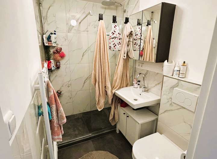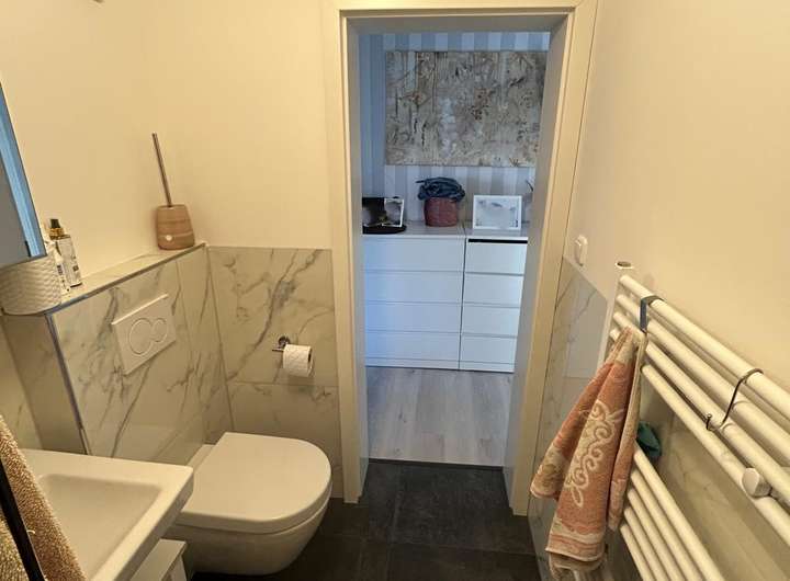 Das Badezimmer wurde 2023 komplett saniert und verfügt über eine ebenerdige Dusche.