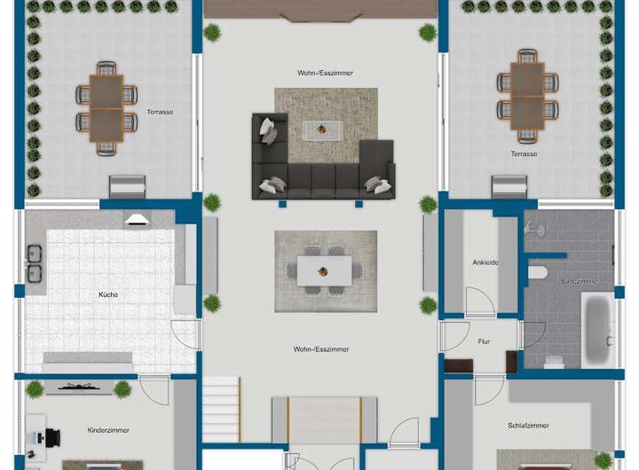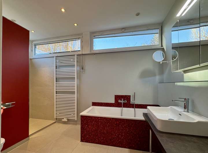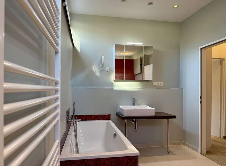 Hervorzuheben sind die im Jahr 2023 neu gestalteten und sanierten Badezimmer, die mit hochwertigen Materialien und modernem Design überzeugen. Eine Badewanne und ein geräumiger Duschbereich runden diesen Bereich ab. Auch die beiden Terrassen sind 2023 saniert worden. Die offenen Raumkonzepte, darunter die stilvolle, große Küche, fördern ein einladendes, luftiges Wohngefühl. Ebenso stehen Ihnen großflächige Teppichböden, pflegeleichte Fliesen sowie funktionales Linoleum als Bodenbeläge zur Verfügung.