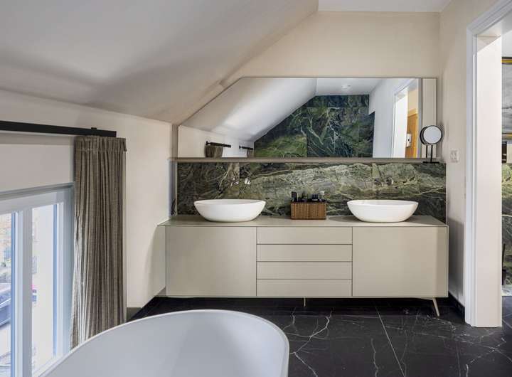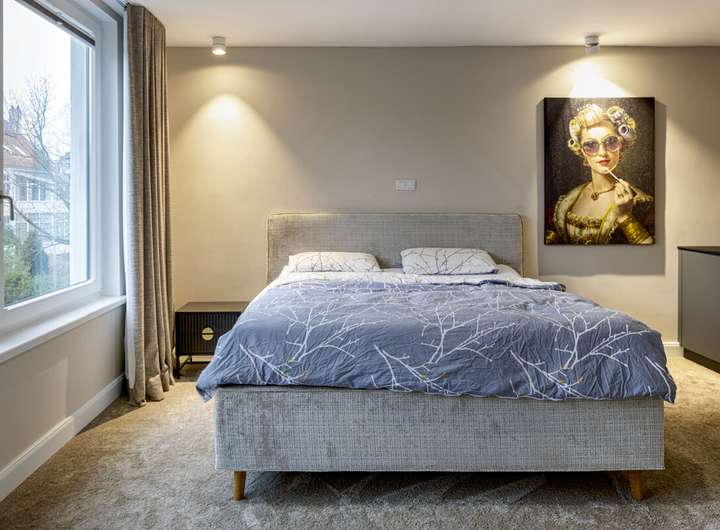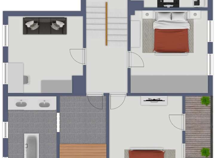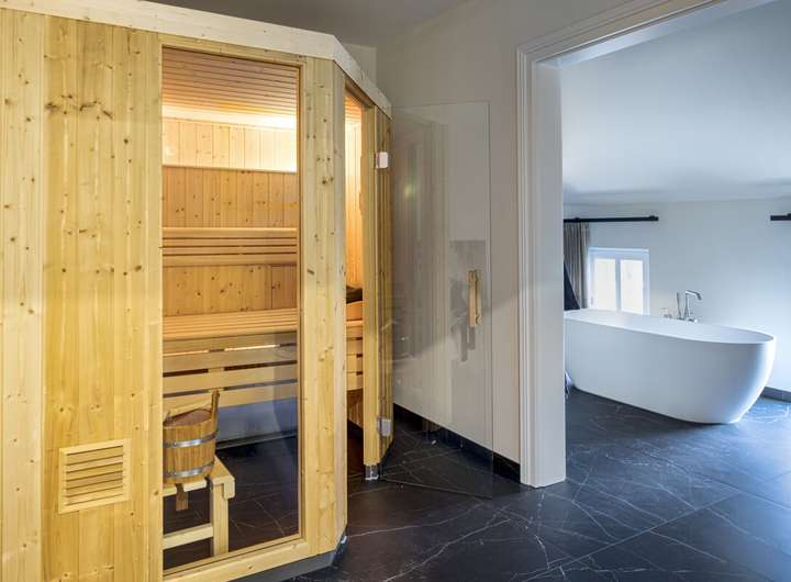 Auf halber Treppe zum Obergeschoss befindet sich ein weiteres Arbeitszimmer, ideal als ruhiger Rückzugsort oder Homeoffice. Das Obergeschoss beherbergt die privaten Wohnräume mit Schlafzimmer, Ankleide und Gästezimmer sowie das großzügige Wellnessbad mit Sauna. Ein Balkon erweitert den Wohnraum ins Freie.