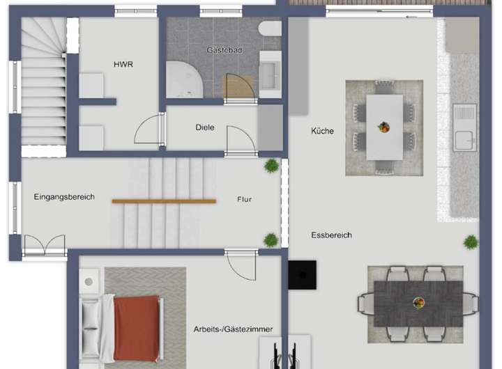 Im Erdgeschoss öffnet sich der Wohn-, Ess- und Kochbereich mit Blick in den Garten. Große Fensterflächen sorgen für helle Räume, während hochwertige Materialien und eine klare Grundrissstruktur ein elegantes Wohnambiente schaffen. Ergänzt wird diese Ebene durch ein Arbeitszimmer, ein Gäste-Duschbad sowie praktische Nebenräume.