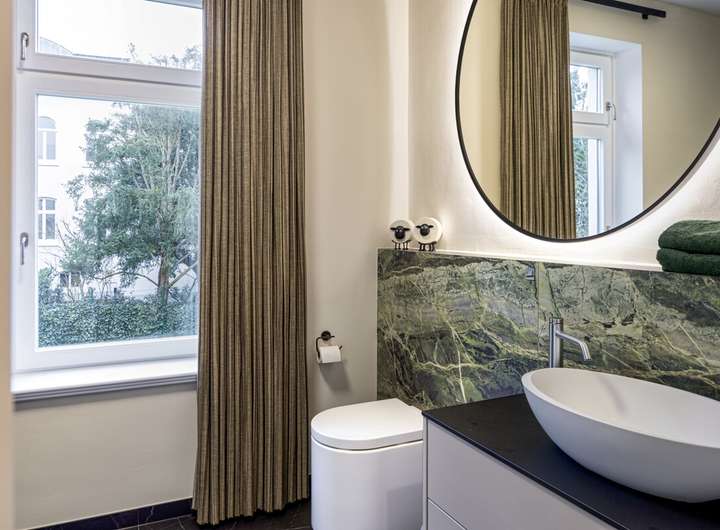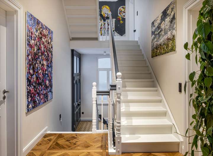 Bereits beim Betreten des Hauses wird der Anspruch der Sanierung spürbar. Das vollständig neu errichtete Treppenhaus, dem historischen Original originalgetreu nachempfunden, bildet das repräsentative Zentrum des Hauses und erschließt alle Ebenen. Stuckelemente, Hamburger Leisten und großzügige Raumhöhen unterstreichen den klassischen Villencharakter.