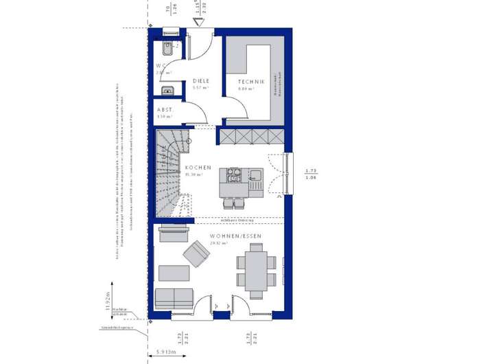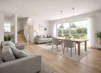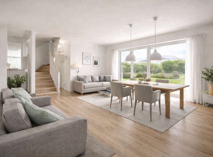 Im Erdgeschoss erwartet Sie ein großzügiger, offen gestalteter Wohn- und Essbereich mit großen Fensterflächen und direktem Zugang zur Terrasse und in den Garten. Die Küche ist harmonisch integriert und bietet ausreichend Platz für gemeinsames Kochen und Leben. Ergänzt wird diese Ebene durch einen Eingangsbereich sowie einen praktischen Technik-/Abstellraum.