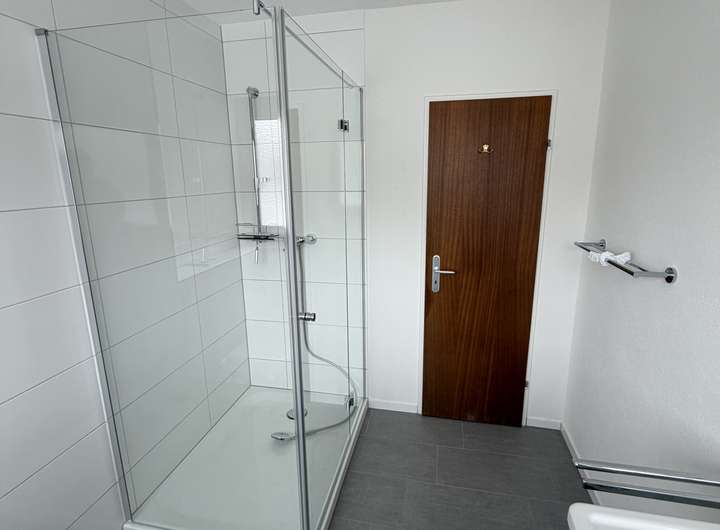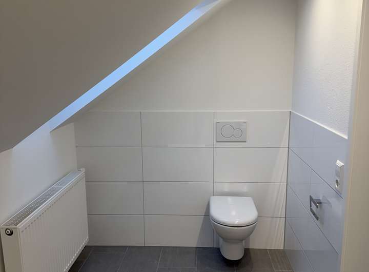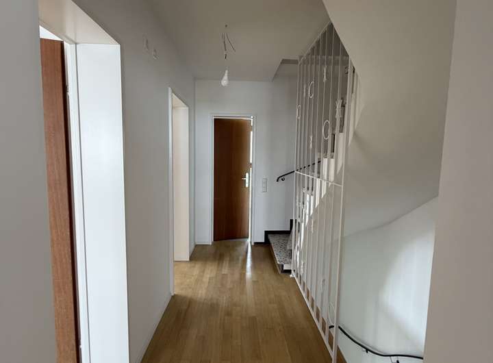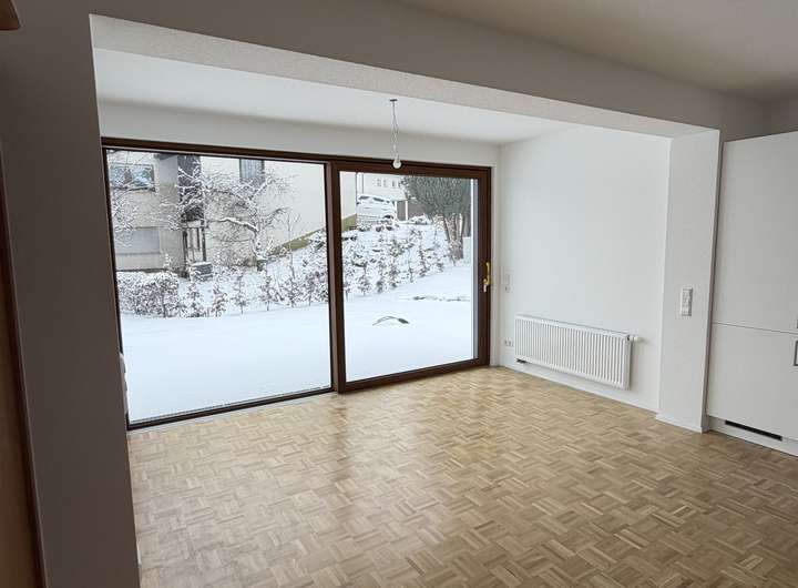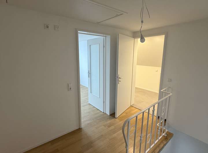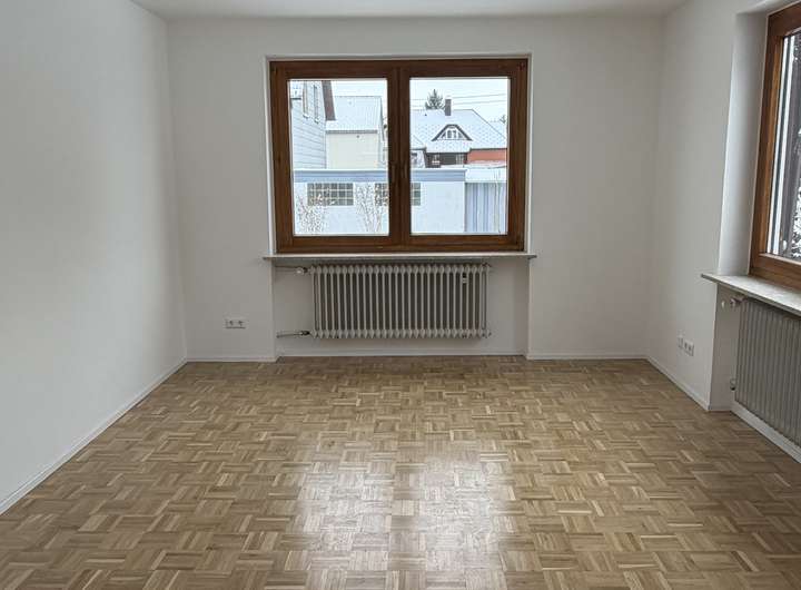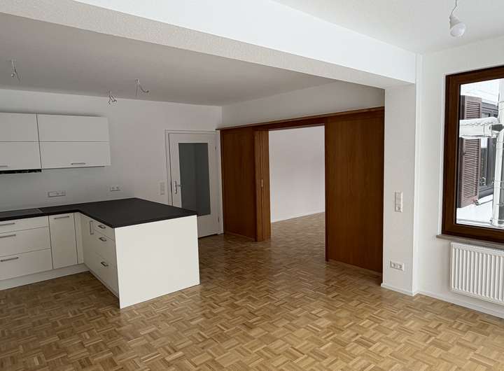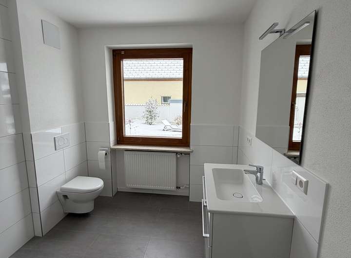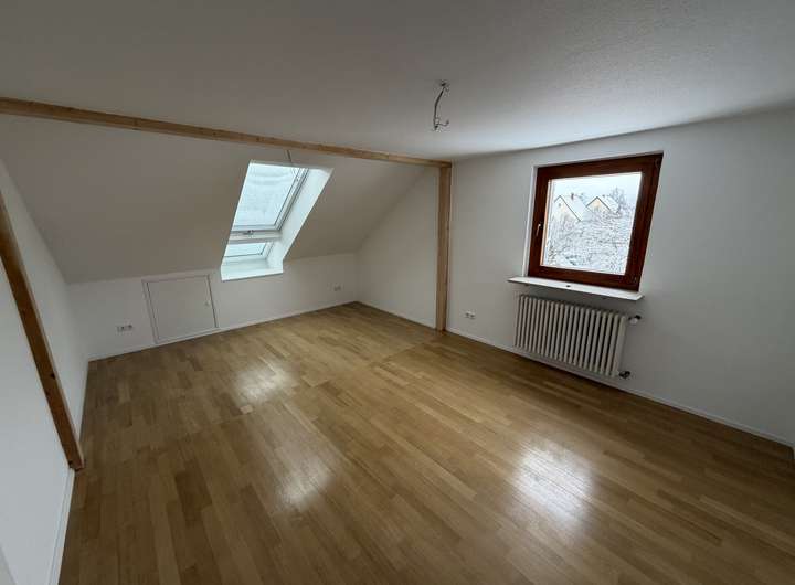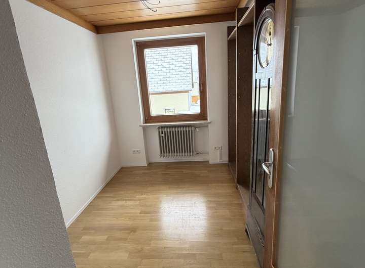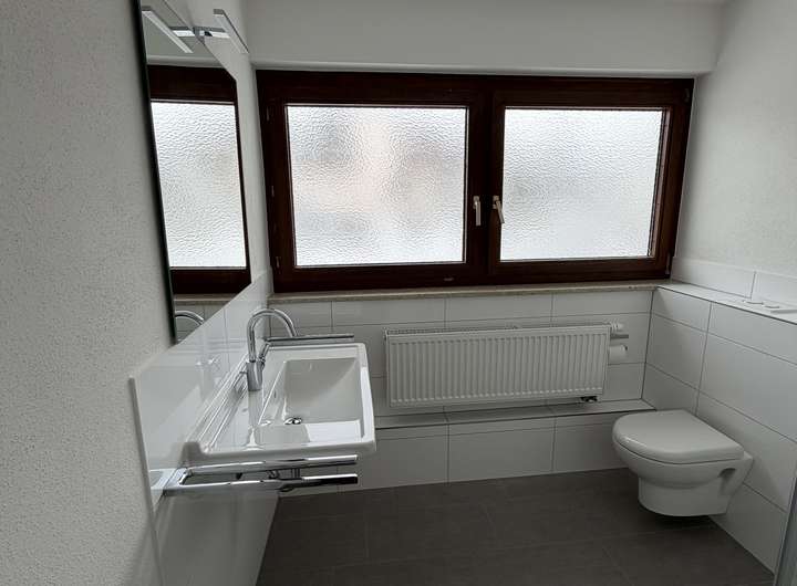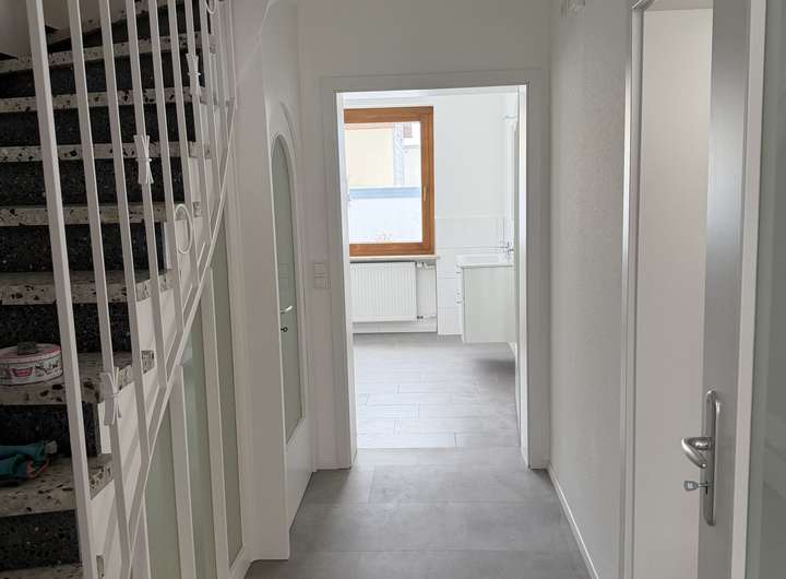 Hochwertig sanierte Doppelhaushälfte in ruhiger, aber stadtnaher Lage mit Gartenanteil zu vermieten. Das Erdgeschoss ist über einen Windfang mit Garderobenbereich zugänglich. Über einen Flur gelangt man zur Küche mit Essbereich, zum großen Wohnzimmer sowie zum Gästebad mit Dusche und WC. Durch eine Schiebetür erreicht man die Außenterrasse. Im OG befinden sich zwei große Räume, ein kleineres Zimmer und ein Badezimmer mit Dusche und WC, im DG ein großes Zimmer, ein Badezimmer mit WC und Badewanne sowie ein Abstellraum. Alle Zimmer sind lichtdurchflutet. Das Haus ist mit einer neueren Pelletheizung ausgestattet. Die Fenster sind aus Holz/Aluminium. Im Wohnzimmer ist ein Anschluss für einen Holzofen bereits installiert. Die drei Kellerräume der Haushälfte sind zusätzlich über eine Außentreppe erreichbar. Mülltonnen und Fahrräder können vor dem Gebäude separat in einem Häusle untergestellt werden.