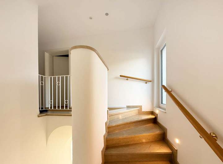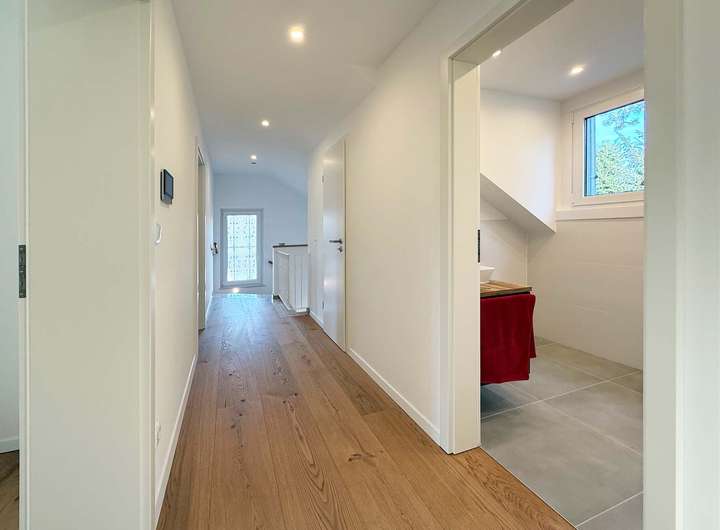 Über eine mit LED-Spots ausgestattete Marmortreppe erreichen Sie das Obergeschoss mit drei Zimmern - alle mit Balkonzugang - zwei Tageslichtbädern und einem praktischen Abstellraum. Alle Wohnräume sind mit hochwertigen Eichenholzdielen ausgestattet.