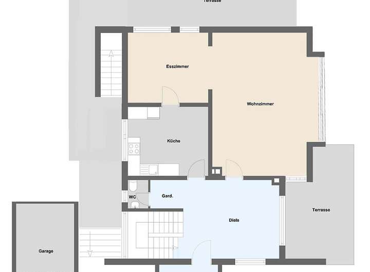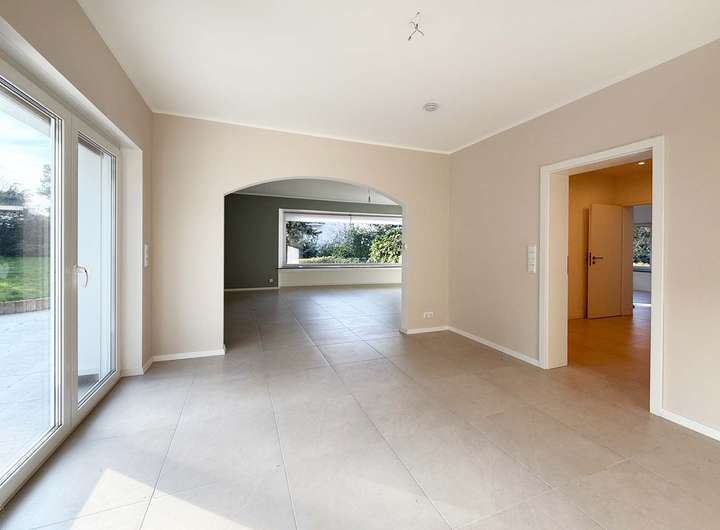 Schon im Erdgeschoss erwartet Sie eine lichtdurchflutete, geräumige Diele mit Garderobe und Gäste-WC. Angrenzend finden Sie den großen Wohnbereich mit Panoramafenster und Zugang zur ersten Terrasse, weiter geht es in den großen Essbereich mit einer weiteren Terrasse, sowie zur Küche, ebenfalls mit Gartenzugang. Der wunderschöne Garten bietet sowohl Privatsphäre als auch viel Freiraum zur Entspannung.
